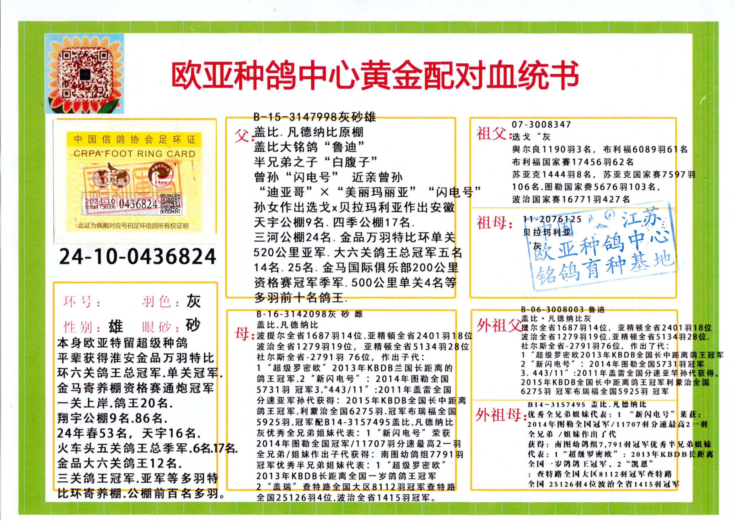 24年秋南京特比环欧亚荣获大团体冠军.小团体冠军551公里大特比13名.14名.16名.19名.20名.21名.24名.26名.27名.28名.42名.52名.54名.57名.65名.66名.68名.70名.71名.72名.74名.76名.80名.82名.83名.84名.85名.86名.90名.92名.110名.116名.121名.122名.128名.131名.158名.161名.164名.165名.166名.172名.174名.177名.182名.195名.196名.201名.205名.208名.210名.216名.253名.269名.275名.276名.294名.296名.299名,,24年秋云南天南铜都公棚决赛415名.天南铜都小棚决赛409名.云南玉活公棚决赛102名.490名.团体32名上笼二羽进二羽,天南铜都大棚506公里决赛445名。热烈祝贺河北省巨鹿县李兰生老师用欧亚泰山号血系连续十一年夺冠军,河北省国家赛冠军.全国季军等多次前十名高位,扬州王军王总用欧亚利奥24年春季获山东翔宇公棚决赛33名盖比53名。南京刘正龙刘总用欧亚盖比获得24年秋山东潍坊国际公棚决赛42名.精英赛30名.三关鸽王71名.决赛86名.加站赛16名.南京市特比环A组鸽王9名.B组鸽王5名.6名.C组鸽王5名.精英赛冠军4名.技能赛A组冠军4名.5名.秦淮区特比环荣获15名.46名.48名.87名。四川西昌徐亮徐总用欧亚利奥获得凉山州聚友决赛177名.第二关亚军双关鸽王19名.三关鸽王105名.云南豪庭公棚决赛603名。热烈祝贺24年四川重庆翔园鸽舍用欧亚泰山号荣获春季400公里冠军.秋季500公里冠军,河北王总用詹森X利奥获得千羽千翔公棚400公里冠军,广东蔡楷焕荣获24年秋爱好者 赛鸽俱乐部三关鸽王季军.一关420公里99名.二关450公里11名.三关520公里32名.单关季军.7名.12名,江西李卫兴荣获贵州红枫公棚8名.共翔俱乐部寄养棚四关综合鸽王30名.一关400公里78名.二关500公里55名.三关520公里37名.四关500公里57名.同父母获公棚18名.雷鸣获得武汉黄浦育翔中心冠军,四川陈文获得四川明鸿俱乐部300公里梦幻2名.3名.4名.9名.10名.13名.14名.15名.31名.34名.40名.41名.42名.43名.69名.71名.72名.73名.74名.94名.95名.97名.98名.99名.419公里决赛荣获总冠军7名.总共归巢9羽,四川徐亮获豪庭决赛603名,山西郑勇获得山西泰鑫公棚决赛255名詹森红狐,热烈祝贺马总获得开尔(飞跃队)决赛9名获奖金1310000万元.第一关52名,天津津福资赛180公里96名.获奖金429543万元,欧亚支持全国鸽友24年秋多人报喜 祝大家取得更好成绩,给欧亚报喜鸽友欧亚决定给每人赠送一羽超级种鸽。欧亚俱乐部特比环多关鸽王成绩:15年秋淮安特比环黑色星期一全会上笼9700多羽,当天无鸽归巢,第二天全会归巢357羽,本舍归巢158羽.前十名八羽.前一百名归巢57羽,16年春季获五关鸽王总冠军,总亚军四名.六名.七名.九名.十名.晶艺俱乐部520公里冠亚季军5名.6名.7名.9名.11名等,火车头冠军.季军6名.8名.9名.10名,16年秋晶艺俱乐部特比环520公里亚军.季军4名.6名.7名.9名,15年春南京白下特比环冠军.亚军.季军6名.7名.8名.9名.10名.指定鸽A B组获得冠军.亚军.季军4名.5名.,17年淮安特比环亚军.4名.5名.7名.8名.10名.六关鸽王总冠军.4名.6名.9名.10名,寄养棚宿迁刘总20羽特比环获冠军.季军.4名.7名.8名.9名等。18年荣获万羽特比环六关鸽王总冠军.总亚军.总季军.6名.8名.十名.单关四羽冠军.二羽亚军.四羽季军.前十名27羽。19年秋万羽特比环六关鸽王总亚军.总季军.5名.8名等,单关二羽冠军.三羽亚军.一羽季军前十名31羽。20年秋淮安市鸽会四关特比环大赛风雨无阻鸽王亚军.鸽王六名,金品俱乐部万羽特比环六关鸽王总冠军,总亚军.四名.五名.六名.七名.八名.十名.前二百名鸽王35羽,单关冠亚季军前十名四十多羽,火车头五关鸽王季军.六名.八名.前二百名鸽王十七羽。20年春荣获淮安五区一市四关鸽王总冠军.亚军.四名.八名.九名。21年秋荣获金品万羽特比环大赛六关鸽王总亚军.总季军.四名.七名.九名.十名.单关冠亚军季军前十名三十多羽。火车头协会鸽王六名.七名.十名.单关前十名十七羽。22年秋荣获鸽王总冠军.总亚军.5名.7名.8名.9名.11名.单关冠亚季军前十名三十多羽,第一关单关前二百名四十多羽,第二关前二百名三十多羽,第三关前二百名四十多羽,第四关前二百名四十多羽,第五关前一百名53羽。23年秋荣获鸽王季军.五名.八名.十名.13名.17名.20名.27名等多羽鸽王.单关前十名二十多羽。公棚.寄养棚部分成绩:16年秋宁夏黄河公棚总冠军电脑戈马力指定通炮冠军,17年送八羽参赛获得鸽王八名进奖四名,支持韩总荣获八名。支持鸽友荣获宁夏中卫公棚决赛总冠军.精英赛冠军,支持18年宁夏黄河公棚决赛冠军詹森X泰山。安徽鼎博寄养棚院内外四关鸽王总冠军.鸽王十七名.三十七名同窝,鸽王39名.42名.58名.67名。18年山东公棚预赛冠军.决赛65名.送八羽进奖五羽.指定获奔驰汽车一辆。支持鸽友获得云南蓝云公棚冠军.盖比X佛卡门。支持鸽友荣获云南银集公棚决赛冠军 詹森427X520血系 速度赛6700羽冠军。17年荣获金马俱乐部寄养棚四关鸽王总冠军.季军.六名.八名.第一关冠军.亚军.季军四名.七名.十一名.金牌教练奖。支持鸽友18年北京费翔公棚预赛九名电脑X桑杰士,支持鸽友荣获陕西威力公棚决赛11名.内蒙古临河寄养棚四关鸽王六名.詹森配泰山,支持河北王总用欧亚詹森427配胡本喜获20年秋开尔青年棚季军。云南东荣公棚16年预赛冠军.决赛77名.17年决赛12名.詹森红狐X泰山,17年平安公棚决赛4名 詹森427。欧亚获得21年金母寄养棚第一关四名.第二关5名.第三关5名.6名.7名.10名.三关鸽王总冠军,四关鸽王14名.十羽鸽王。支持河