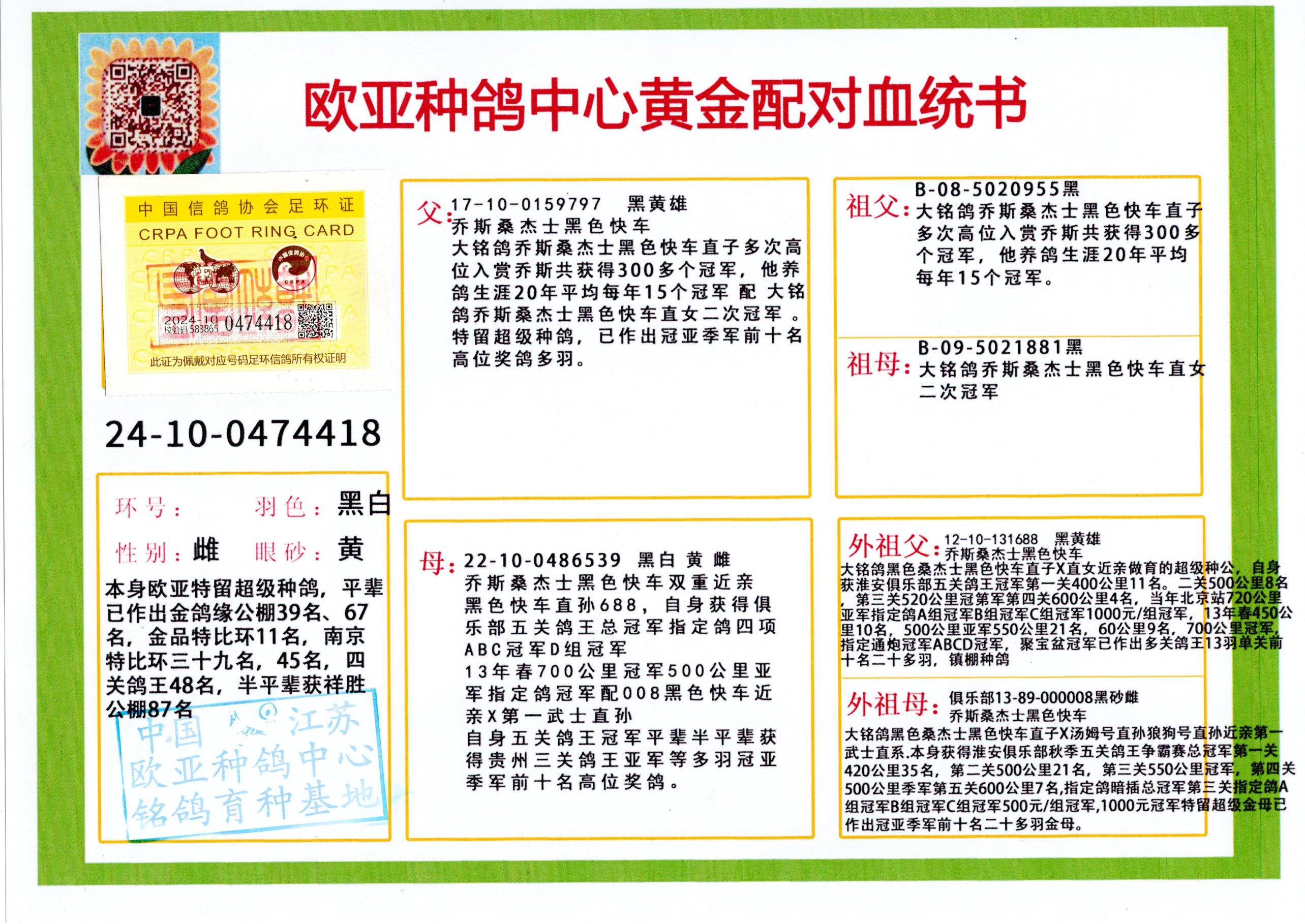 24年秋南京特比环欧亚荣获大团体冠军.小团体冠军551公里大特比13名.14名.16名.19名.20名.21名.24名.26名.27名.28名.42名.52名.54名.57名.65名.66名.68名.70名.71名.72名.74名.76名.80名.82名.83名.84名.85名.86名.90名.92名.110名.116名.121名.122名.128名.131名.158名.161名.164名.165名.166名.172名.174名.177名.182名.195名.196名.201名.205名.208名.210名.216名.253名.269名.275名.276名.294名.296名.299名,,24年秋云南天南铜都公棚决赛415名.天南铜都小棚决赛409名.云南玉活公棚决赛102名.490名.团体32名上笼二羽进二羽,天南铜都大棚506公里决赛445名。热烈祝贺河北省巨鹿县李兰生老师用欧亚泰山号血系连续十一年夺冠军,河北省国家赛冠军.全国季军等多次前十名高位,扬州王军王总用欧亚利奥24年春季获山东翔宇公棚决赛33名盖比53名。南京刘正龙刘总用欧亚盖比获得24年秋山东潍坊国际公棚决赛42名.精英赛30名.三关鸽王71名.决赛86名.加站赛16名.南京市特比环A组鸽王9名.B组鸽王5名.6名.C组鸽王5名.精英赛冠军4名.技能赛A组冠军4名.5名.秦淮区特比环荣获15名.46名.48名.87名。四川西昌徐亮徐总用欧亚利奥获得凉山州聚友决赛177名.第二关亚军双关鸽王19名.三关鸽王105名.云南豪庭公棚决赛603名。热烈祝贺24年四川重庆翔园鸽舍用欧亚泰山号荣获春季400公里冠军.秋季500公里冠军,河北王总用詹森X利奥获得千羽千翔公棚400公里冠军,广东蔡楷焕荣获24年秋爱好者 赛鸽俱乐部三关鸽王季军.一关420公里99名.二关450公里11名.三关520公里32名.单关季军.7名.12名,江西李卫兴荣获贵州红枫公棚8名.共翔俱乐部寄养棚四关综合鸽王30名.一关400公里78名.二关500公里55名.三关520公里37名.四关500公里57名.同父母获公棚18名.雷鸣获得武汉黄浦育翔中心冠军,四川陈文获得四川明鸿俱乐部300公里梦幻2名.3名.4名.9名.10名.13名.14名.15名.31名.34名.40名.41名.42名.43名.69名.71名.72名.73名.74名.94名.95名.97名.98名.99名.419公里决赛荣获总冠军7名.总共归巢9羽,四川徐亮获豪庭决赛603名,山西郑勇获得山西泰鑫公棚决赛255名詹森红狐,热烈祝贺马总获得开尔(飞跃队)决赛9名获奖金1310000万元.第一关52名,天津津福资赛180公里96名.获奖金429543万元,欧亚支持全国鸽友24年秋多人报喜 祝大家取得更好成绩,给欧亚报喜鸽友欧亚决定给每人赠送一羽超级种鸽。欧亚俱乐部特比环多关鸽王成绩:15年秋淮安特比环黑色星期一全会上笼9700多羽,当天无鸽归巢,第二天全会归巢357羽,本舍归巢158羽.前十名八羽.前一百名归巢57羽,16年春季获五关鸽王总冠军,总亚军四名.六名.七名.九名.十名.晶艺俱乐部520公里冠亚季军5名.6名.7名.9名.11名等,火车头冠军.季军6名.8名.9名.10名,16年秋晶艺俱乐部特比环520公里亚军.季军4名.6名.7名.9名,15年春南京白下特比环冠军.亚军.季军6名.7名.8名.9名.10名.指定鸽A B组获得冠军.亚军.季军4名.5名.,17年淮安特比环亚军.4名.5名.7名.8名.10名.六关鸽王总冠军.4名.6名.9名.10名,寄养棚宿迁刘总20羽特比环获冠军.季军.4名.7名.8名.9名等。18年荣获万羽特比环六关鸽王总冠军.总亚军.总季军.6名.8名.十名.单关四羽冠军.二羽亚军.四羽季军.前十名27羽。19年秋万羽特比环六关鸽王总亚军.总季军.5名.8名等,单关二羽冠军.三羽亚军.一羽季军前十名31羽。20年秋淮安市鸽会四关特比环大赛风雨无阻鸽王亚军.鸽王六名,金品俱乐部万羽特比环六关鸽王总冠军,总亚军.四名.五名.六名.七名.八名.十名.前二百名鸽王35羽,单关冠亚季军前十名四十多羽,火车头五关鸽王季军.六名.八名.前二百名鸽王十七羽。20年春荣获淮安五区一市四关鸽王总冠军.亚军.四名.八名.九名。21年秋荣获金品万羽特比环大赛六关鸽王总亚军.总季军.四名.七名.九名.十名.单关冠亚军季军前十名三十多羽。火车头协会鸽王六名.七名.十名.单关前十名十七羽。22年秋荣获鸽王总冠军.总亚军.5名.7名.8名.9名.11名.单关冠亚季军前十名三十多羽,第一关单关前二百名四十多羽,第二关前二百名三十多羽,第三关前二百名四十多羽,第四关前二百名四十多羽,第五关前一百名53羽。23年秋荣获鸽王季军.五名.八名.十名.13名.17名.20名.27名等多羽鸽王.单关前十名二十多羽。公棚.寄养棚部分成绩:16年秋宁夏黄河公棚总冠军电脑戈马力指定通炮冠军,17年送八羽参赛获得鸽王八名进奖四名,支持韩总荣获八名。支持鸽友荣获宁夏中卫公棚决赛总冠军.精英赛冠军,支持18年宁夏黄河公棚决赛冠军詹森X泰山。安徽鼎博寄养棚院内外四关鸽王总冠军.鸽王十七名.三十七名同窝,鸽王39名.42名.58名.67名。18年山东公棚预赛冠军.决赛65名.送八羽进奖五羽.指定获奔驰汽车一辆。支持鸽友获得云南蓝云公棚冠军.盖比X佛卡门。支持鸽友荣获云南银集公棚决赛冠军 詹森427X520血系 速度赛6700羽冠军。17年荣获金马俱乐部寄养棚四关鸽王总冠军.季军.六名.八名.第一关冠军.亚军.季军四名.七名.十一名.金牌教练奖。支持鸽友18年北京费翔公棚预赛九名电脑X桑杰士,支持鸽友荣获陕西威力公棚决赛11名.内蒙古临河寄养棚四关鸽王六名.詹森配泰山,支持河北王总用欧亚詹森427配胡本喜获20年秋开尔青年棚季军。云南东荣公棚16年预赛冠军.决赛77名.17年决赛12名.詹森红狐X泰山,17年平安公棚决赛4名 詹森427。欧亚获得21年金母寄养棚第一关四名.第二关5名.第三关5名.6名.7名.10名.三关鸽王总冠军,四关鸽王14名.十羽鸽王。支持河