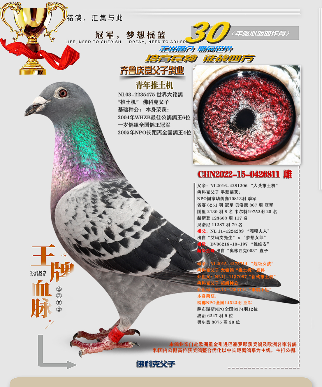 感谢齐鲁良父子鸽业刘总支援巴赛罗那血统配我家彼得曼德斯血统,在今年四关鸽王大赛斩获5名,此鸽也是去年800特比小号只取10名的情况下飞进10名,获奖金一万元!再次感谢刘总!!!
