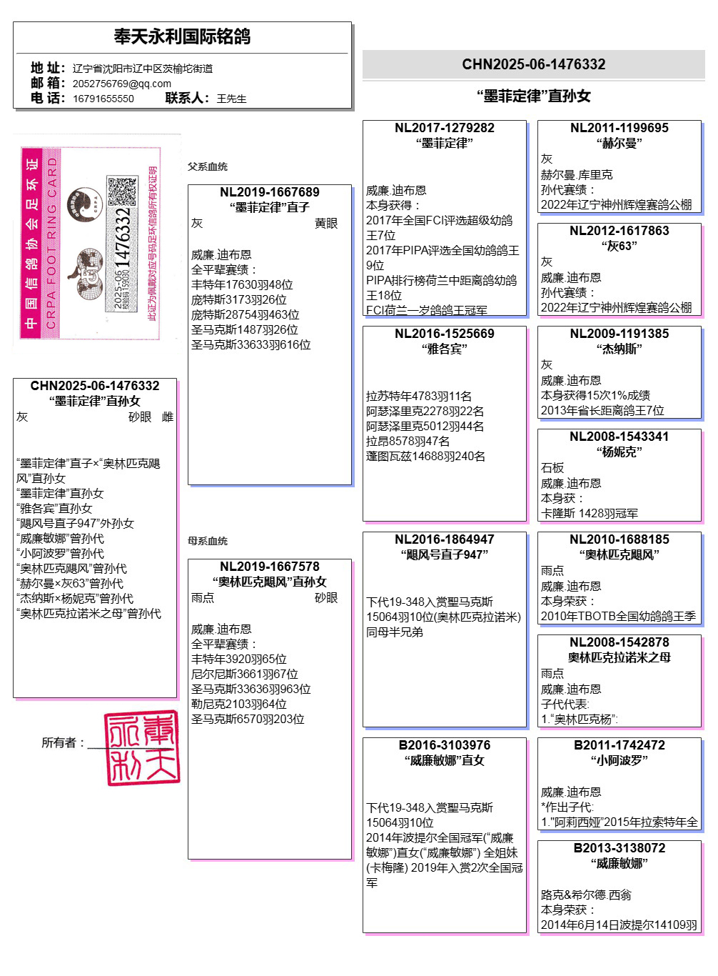 母亲:NL2019-1667578“奥林匹克飓风”直孙女