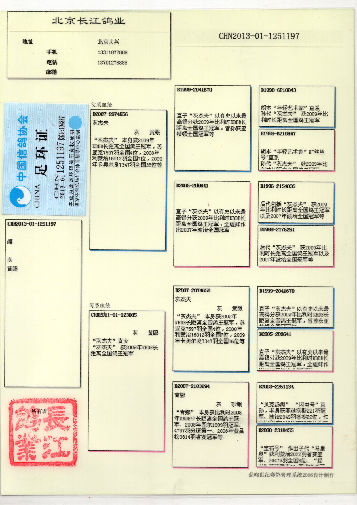 本身获2009年KBDB长距离全国鸽王冠军,