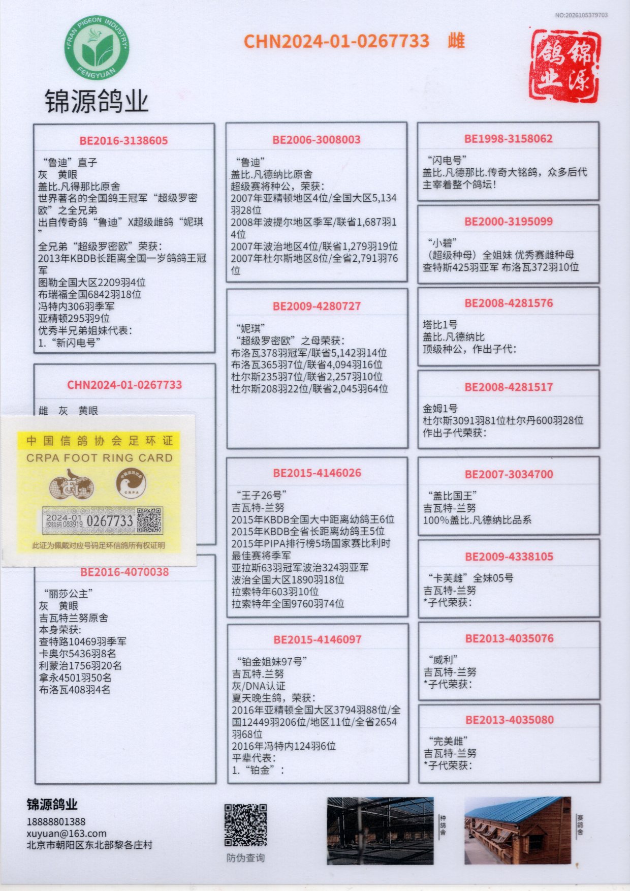 世界著名的全国鸽王冠军“超级罗密欧”之全兄弟出自传奇鸽“鲁迪”X超级雌鸽“妮琪”全兄弟“超级罗密欧”荣获: