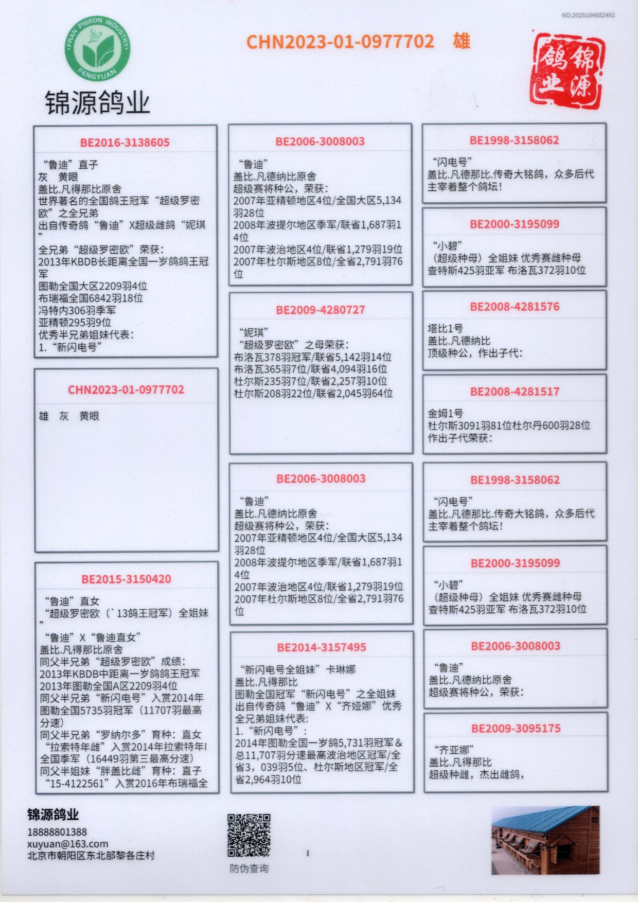 世界著名的全国鸽王冠军“超级罗密欧”之全兄弟出自传奇鸽“鲁迪”X超级雌鸽“妮琪”全兄弟“超级罗密欧”荣获: