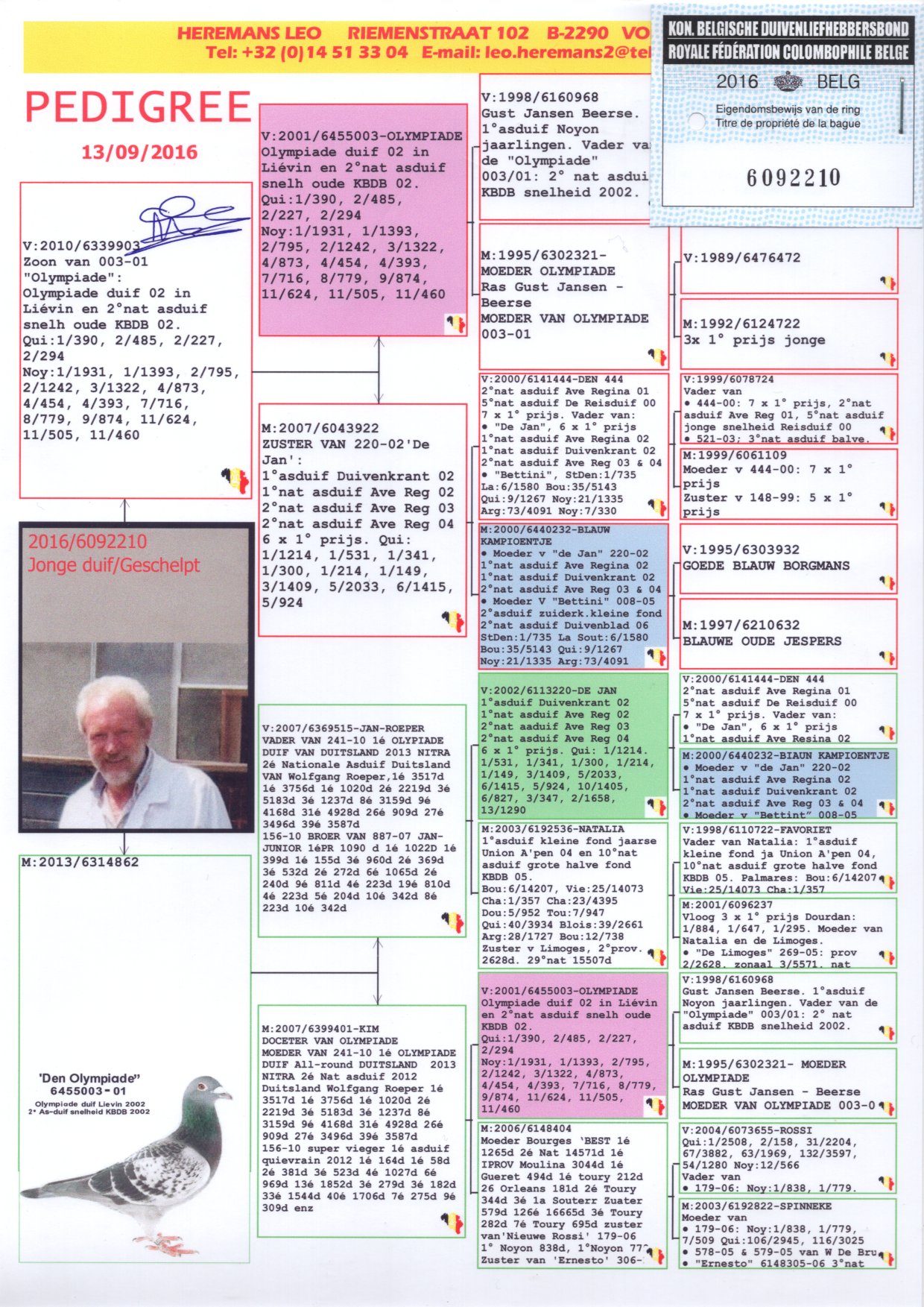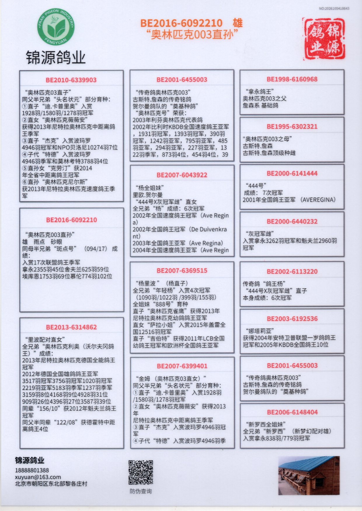 全兄弟“奥林匹克利奥(沃尔夫冈鸽王)”成绩: