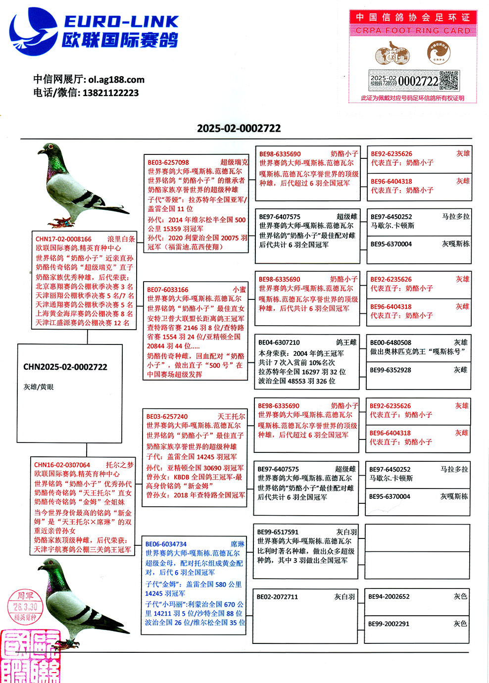 - 当前查看拍卖鸽:奶酪世界铭鸽“098”近亲直孙