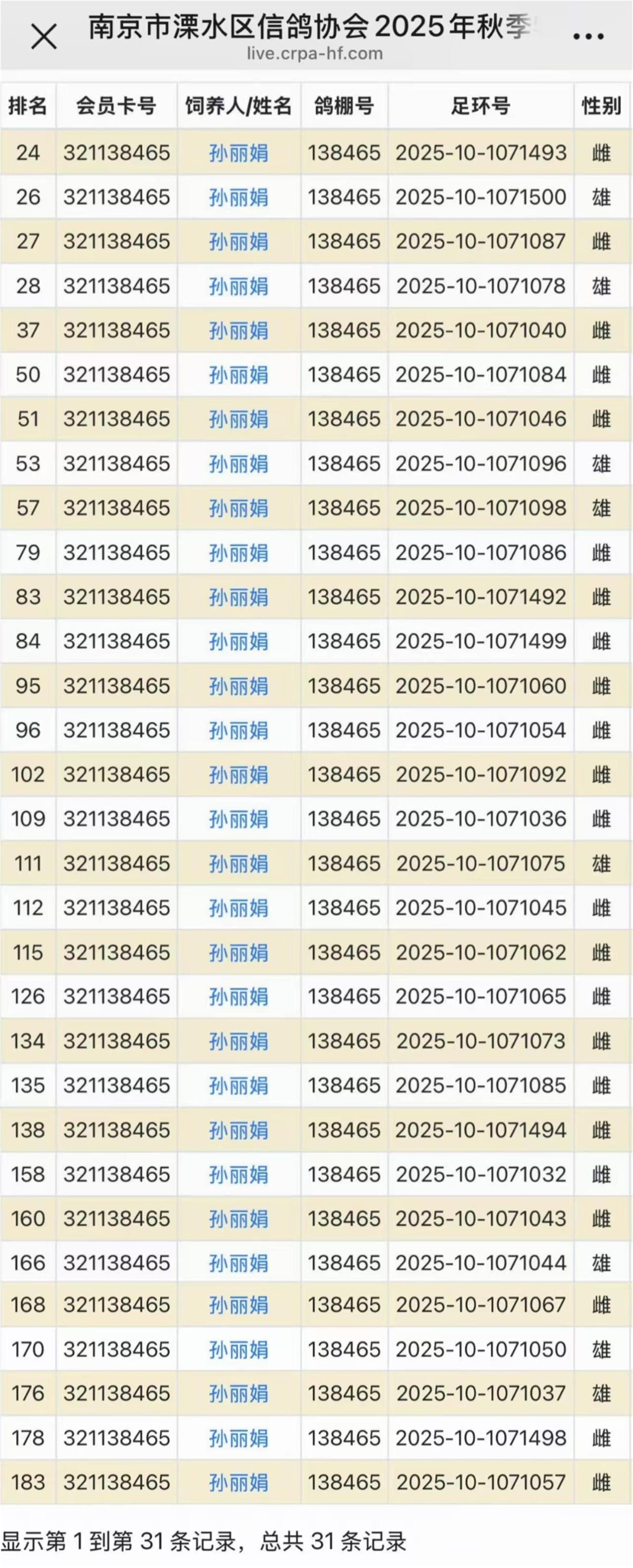 24年秋南京特比环欧亚荣获大团体冠军.小团体冠军551公里大特比13名.14名.16名.19名.20名.21名.24名.26名.27名.28名.42名.52名.54名.57名.65名.66名.68名.70名.71名.72名.74名.76名.80名.82名.83名.84名.85名.86名.90名.92名.110名.116名.121名.122名.128名.131名.158名.161名.164名.165名.166名.172名.174名.177名.182名.195名.196名.201名.205名.208名.210名.216名.253名.269名.275名.276名.294名.296名.299名24年秋云南天南铜都公棚决赛415名.天南铜都小棚决赛409名.云南玉活公棚决赛102名.490名.团体32名上笼二羽进二羽,天南铜都大棚506公里决赛445名.热烈祝贺河北省巨鹿县李兰生老师用欧亚泰山号血系连续十一年夺冠军,河北省国家赛冠军.全国季军等多次前十名高位扬州王军王总用欧亚利奥24年春季获山东翔宇公棚决赛33名盖比53名。南京刘正龙刘总用欧亚盖比获得24年秋山东潍坊国际公棚决赛42名.精英赛30名.三关鸽王71名.决赛86名.加站赛16名.南京市特比环A组鸽王9名.B组鸽王5名.6名.C组鸽王5名.精英赛冠军4名.技能赛A组冠军4名.5名.秦淮区特比环荣获15名.46名.48名.87名。四川西昌徐亮徐总用欧亚利奥获得凉山州聚友决赛177名.第二关亚军双关鸽王19名.三关鸽王105名.云南豪庭公棚决赛603名。热烈祝贺24年四川重庆翔园鸽舍用欧亚泰山号荣获春季400公里冠军.秋季500公里冠军,河北王总用詹森X利奥获得千羽千翔公棚400公里冠军,广东蔡楷焕荣获24年秋爱好者赛鸽俱乐部三关鸽王季军.一关420公里99名.二关450公里11名.三关520公里32名.单关季军.7名.12名,江西李卫兴荣获贵州红枫公棚8名.共翔俱乐部寄养棚四关综合鸽王30名.一关400公里78名.二关500公里55名.三关520公里37名.四关500公里57名.同父母获公棚18名.雷鸣获得武汉黄浦育翔中心冠军,四川陈文获得四川明鸿俱乐部300公里梦幻2名.3名.4名.9名.10名.13名.14名.15名.31名.34名.40名.41名.42名.43名.69名.71名.72名.73名.74名.94名.95名.97名.98名.99名.419公里决赛荣获总冠军7名.总共归巢9羽,四川徐亮获豪庭决赛603名,山西郑勇获得山西泰鑫公棚决赛255名詹森红狐,热烈祝贺马总获得开尔(飞跃队)决赛9名获奖金1310000万元.第一关52名,天津津福资赛180公里96名.获奖金429543万元,欧亚支持全国鸽友24年秋多人报喜祝大家取得更好成绩,给欧亚报喜鸽友欧亚决定给每人赠送一羽超级种鸽。欧亚俱乐部特比环多关鸽王成绩:15年秋淮安特比环黑色星期一全会上笼9700多羽,当天无鸽归巢,第二天全会归巢357羽,本舍归巢158羽.前十名八羽.前一百名归巢57羽,16年春季获五关鸽王总冠军,总亚军四名.六名.七名.九名.十名.晶艺俱乐部520公里冠亚季军5名.6名.7名.9名.11名等,火车头冠军.季军6名.8名.9名.10名,16年秋晶艺俱乐部特比环520公里亚军.季军4名.6名.7名.9名,15年春南京白下特比环冠军.亚军5名.6名.8名前三百名获奖53羽,团体冠军.亚军.,16年春南京江北三区特比环上笼58羽前二百名进奖46羽亚军.季军6名.7名.8名.9名.10名.指定鸽A B组获得冠军.亚军.季军4名.5名.17年淮安特比环亚军.4名.5名.7名.8名.10名.六关鸽王总冠军.4名.6名.9名.10名,寄养棚宿迁刘总20羽特比环获冠军.季军.4名.7名.8名.9名等。18年荣获万羽特比环六关鸽王总冠军.总亚军.总季军.6名.8名.十名.单关四羽冠军.二羽亚军.四羽季军.前十名27羽。19年秋万羽特比环六关鸽王总亚军.总季军.5名.8名等,单关二羽冠军.三羽亚军.一羽季军前十名31羽。20年秋淮安市鸽会四关特比环大赛风雨无阻鸽王亚军.鸽王六名,金品俱乐部万羽特比环六关鸽王总冠军,总亚军.四名.五名.六名.七名.八名.十名.前二百名鸽王35羽,单关冠亚季军前十名四十多羽,火车头五关鸽王季军.六名.八名.前二百名鸽王十七羽。20年春荣获淮安五区一市四关鸽王总冠军.亚军.四名.八名.九名。21年秋荣获金品万羽特比环大赛六关鸽王总亚军.总季军.四名.七名.九名.十名.单关冠亚军季军前十名三十多羽。火车头协会鸽王六名.七名.十名.单关前十名十七羽。22年秋荣获鸽王总冠军.总亚军.5名.7名.8名.9名.11名.单关冠亚季军前十名三十多羽,第一关单关前二百名四十多羽,第二关前二百名三十多羽,第三关前二百名四十多羽,第四关前二百名四十多羽,第五关前一百名53羽。23年秋荣获鸽王季军.五名.八名.十名.13名.17名.20名.27名等多羽鸽王.单关前十名二十多羽。公棚.寄养棚部分成绩:16年秋宁夏黄河公棚总冠军电脑戈马力指定通炮冠军,17年送八羽参赛获得鸽王八名进奖四名,支持韩总荣获八名。支持鸽友荣获宁夏中卫公棚决赛总冠军.精英赛冠军,支持18年宁夏黄河公棚决赛冠军詹森X泰山。安徽鼎博寄养棚院内外四关鸽王总冠军.鸽王十七名.三十七名同窝,鸽王39名.42名.58名.67名。18年山东公棚预赛冠军.决赛65名.送八羽进奖五羽.指定获奔驰汽车一辆。支持鸽友获得云南蓝云公棚冠军.盖比X佛卡门。支持鸽友荣获云南银集公棚决赛冠军詹森427X520血系速度赛6700羽冠军。17年荣获金马俱乐部寄养棚四关鸽王总冠军.季军.六名.八名.第一关冠军.亚军.季军四名.七名.十一名.金牌教练奖。支持鸽友18年北京费翔公棚预赛九名电脑X桑杰士,支持鸽友荣获陕西威力公棚决赛11名.内蒙古临河寄养棚四关鸽王六名.詹森配泰山支持河北王总用欧亚詹森427配胡本喜获20年秋开尔青年棚季军。云南东荣公棚16年预赛冠军.决赛77名.17年决赛12名.詹森红狐X泰山,17年平安公棚决赛4名詹森427。欧亚获得21年金母寄养棚第