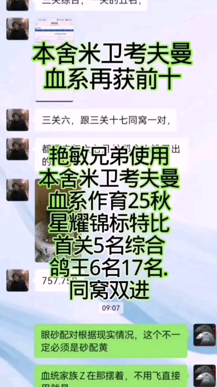 感谢兄弟发来喜报荣誉时刻共享,祝贺兄弟使用本舍米卫考夫曼血系作育25秋星耀锦标特比首关5名综合鸽王6名17名,同窝双进,这已是本舍米卫鸽王家族支援各地鸽友25年斩获的第13个前十奖项,本舍米卫鸽王家族 你有信心他定不负期待 为兄弟喝彩!