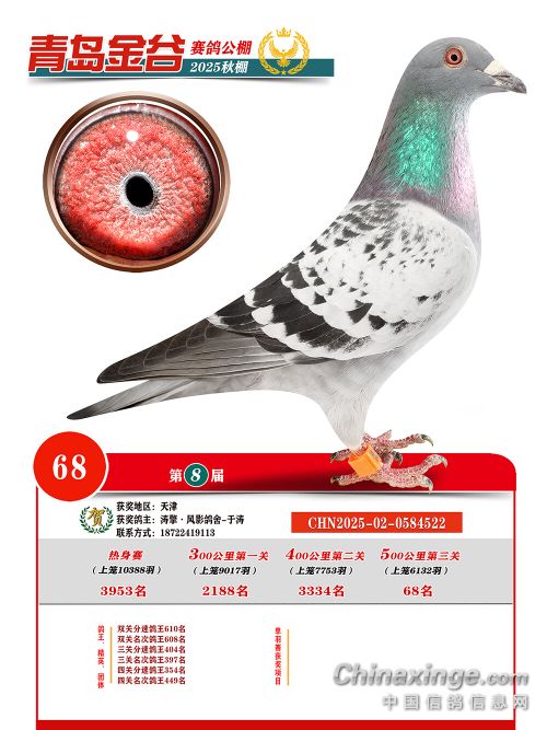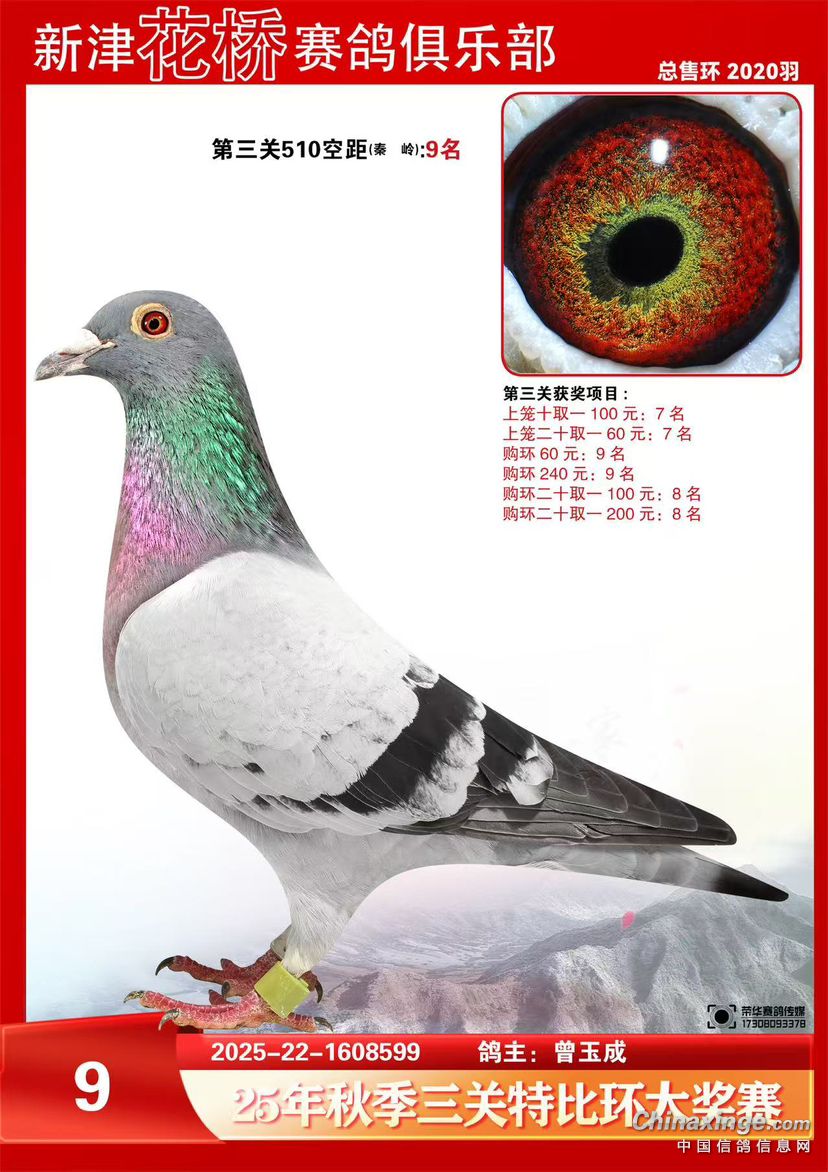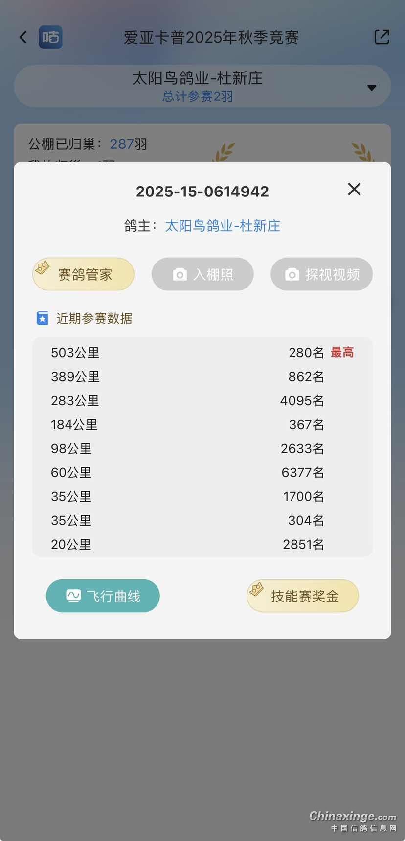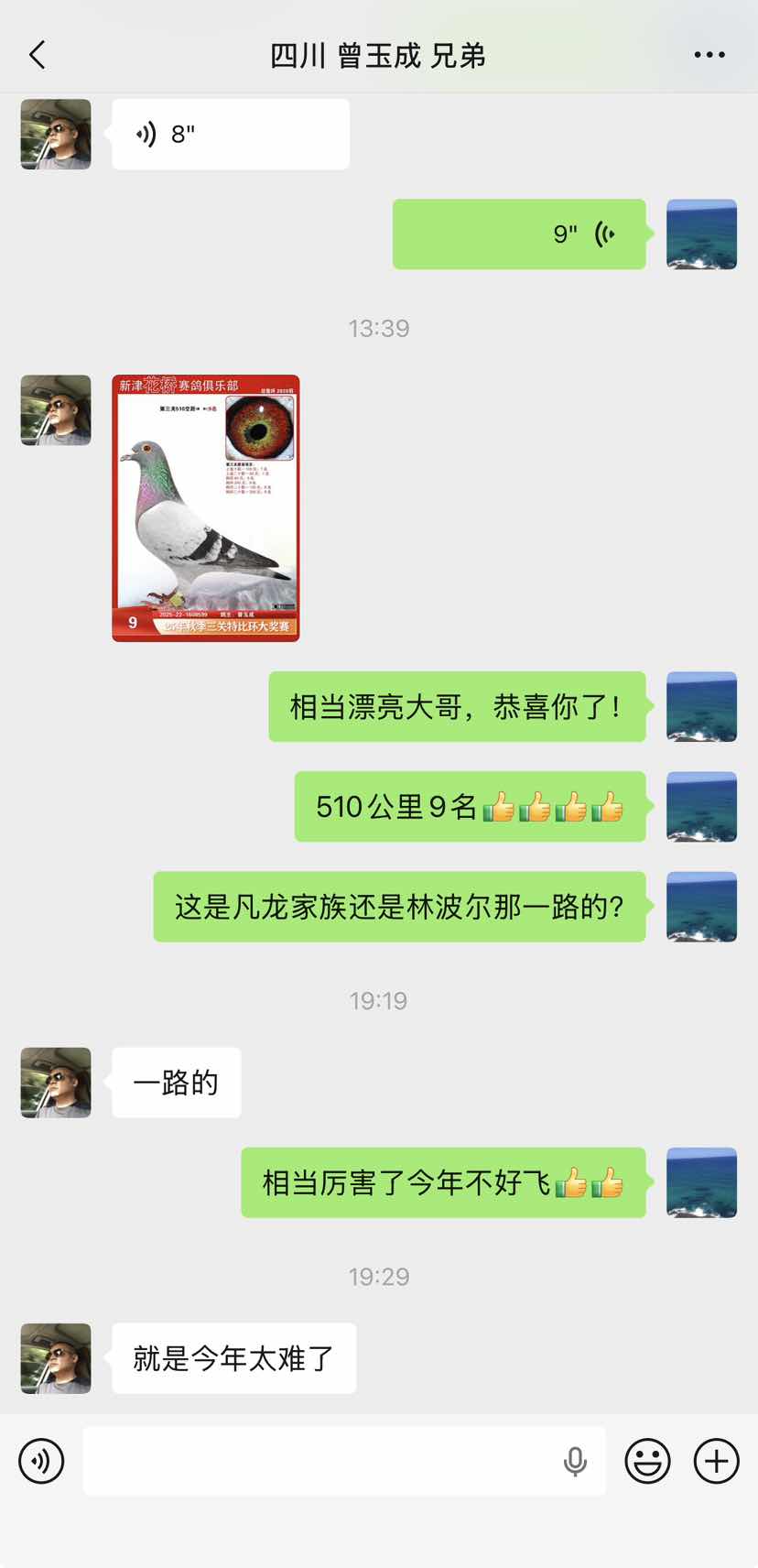 热烈祝贺四川成都好大哥用本舍林波尔凡龙家族种鸽后代秦岭大赛510公里喜获9名好成绩!赛绩说明一切,实战才是硬道理!希望大哥再创佳绩报喜!