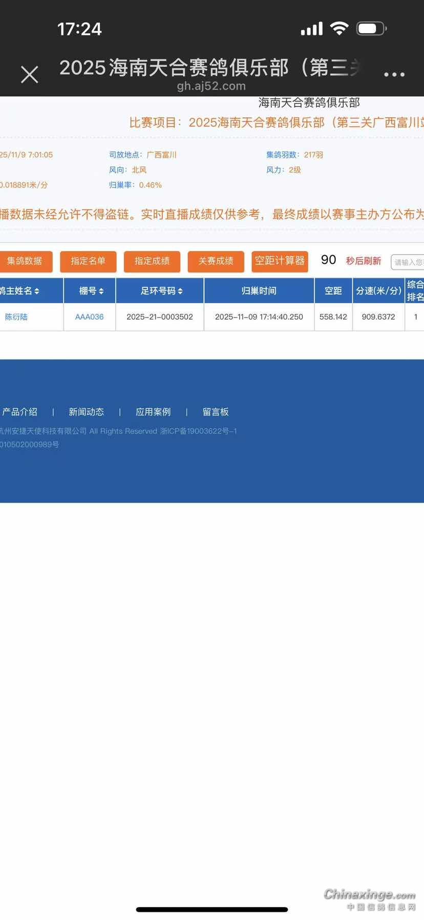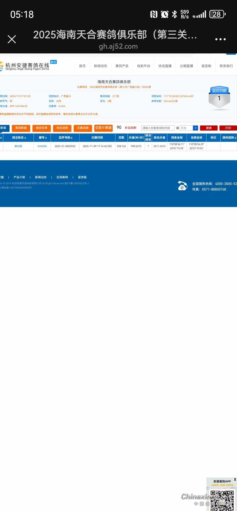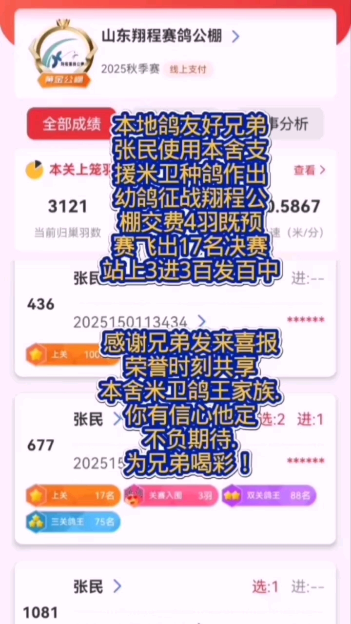 本舍米卫鸽王家族支援全国各地鸽友惊喜不断。感谢张民兄弟发来的获奖喜报,也祝贺兄弟使用本舍米卫家族种鸽,作出幼鸽征战翔程公棚,既预赛飞出17名,决赛又飞出436名677名1081名,探视缴费4羽,决赛上3进3,决赛站百发百中。本舍米卫鸽王家族 你有信心他定不负期待 为兄弟喝彩!