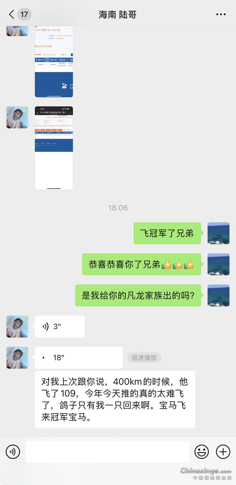 热烈祝贺海南好兄弟今天用本舍凡龙家族种鸽后代,过五关斩六将,关关艰难赛事第三关决赛喜获全会伯马冠军(全会灭关就回一羽)赛鸽至高荣誉!希望明年再创辉煌报喜,赛绩说明一切,实战才是硬道理!