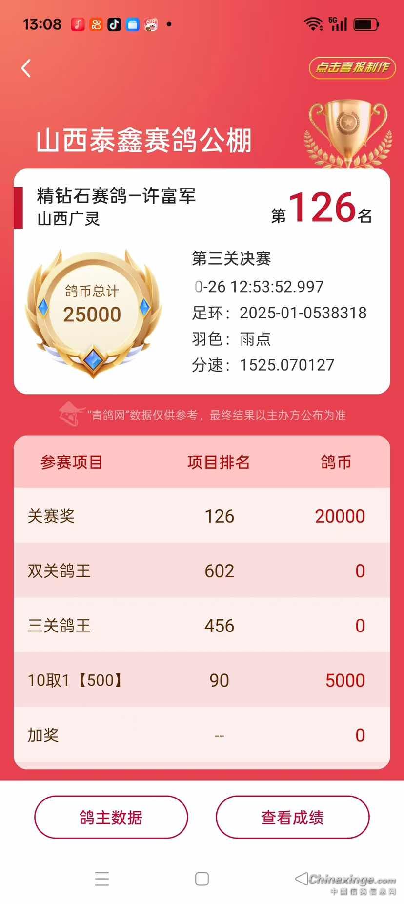 热烈祝贺山西好兄弟用本舍凡龙家族种鸽子代在泰鑫公棚决赛喜获126名好成绩!赢得奖金2万多,希望兄弟再创佳绩,赛绩说明一切实战才是硬道理!