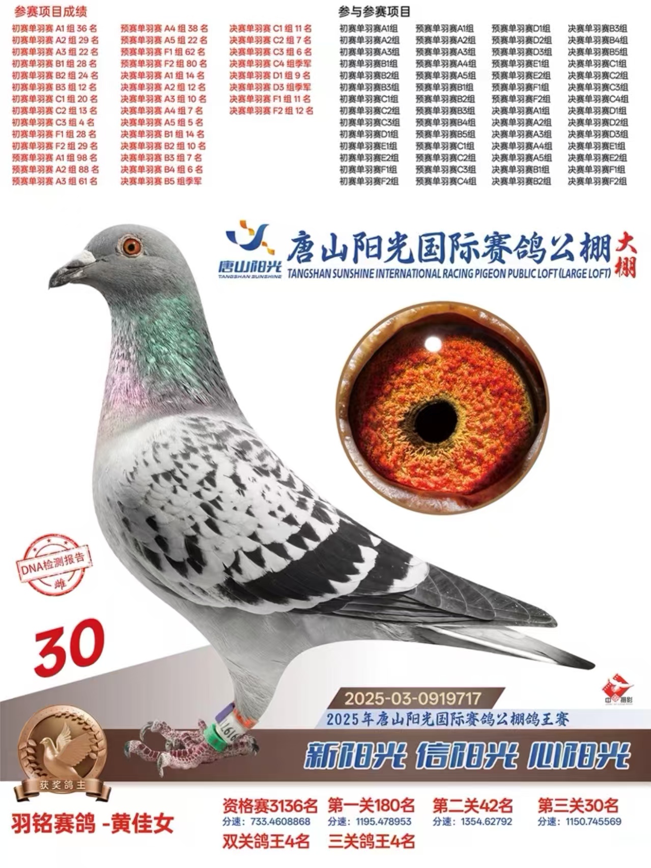恭喜鸽友黄佳女,使翔开尔盖比、杨欧瓦克后裔,斩获阳光大棚双关鸽王殿军、三关鸽王殿军、第二关42名、决赛30名。