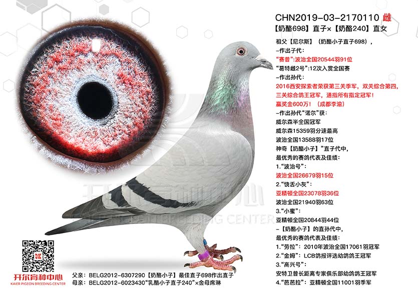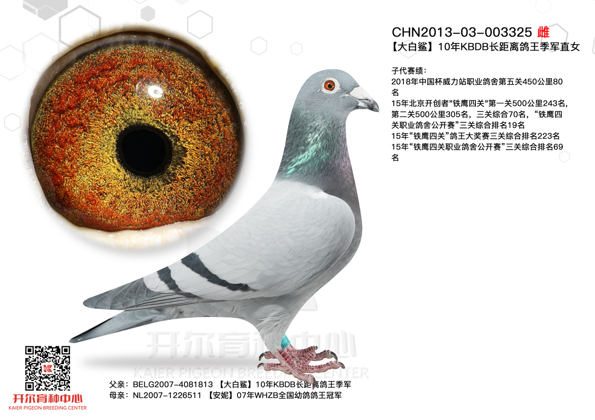 殿军母亲是杨欧瓦克与利奥的结合,光芒万丈与大白鲨和安妮作育,光芒万丈是千万国王亲兄弟万千宠爱的直子,源自杨欧瓦克至尊双雄之483及亲兄弟伟大号。大白鲨自身是KBDB长距离鸽王季军。安妮是利奥欧元外孙女,本身斩获07年WHZB全国幼鸽鸽王冠军。