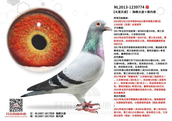 239同样流淌着威廉迪布恩的血脉,是奥林匹克颶風双重近亲回血,父亲墨菲定律同父弟弟,是颶風外孙女玛莉安娜027的直子,母亲由颶風直孙奔腾年代与墨菲定律直女墨菲403号作育,是PIPA速度鸽鸽王全国17位、亚拉斯12930羽10名。