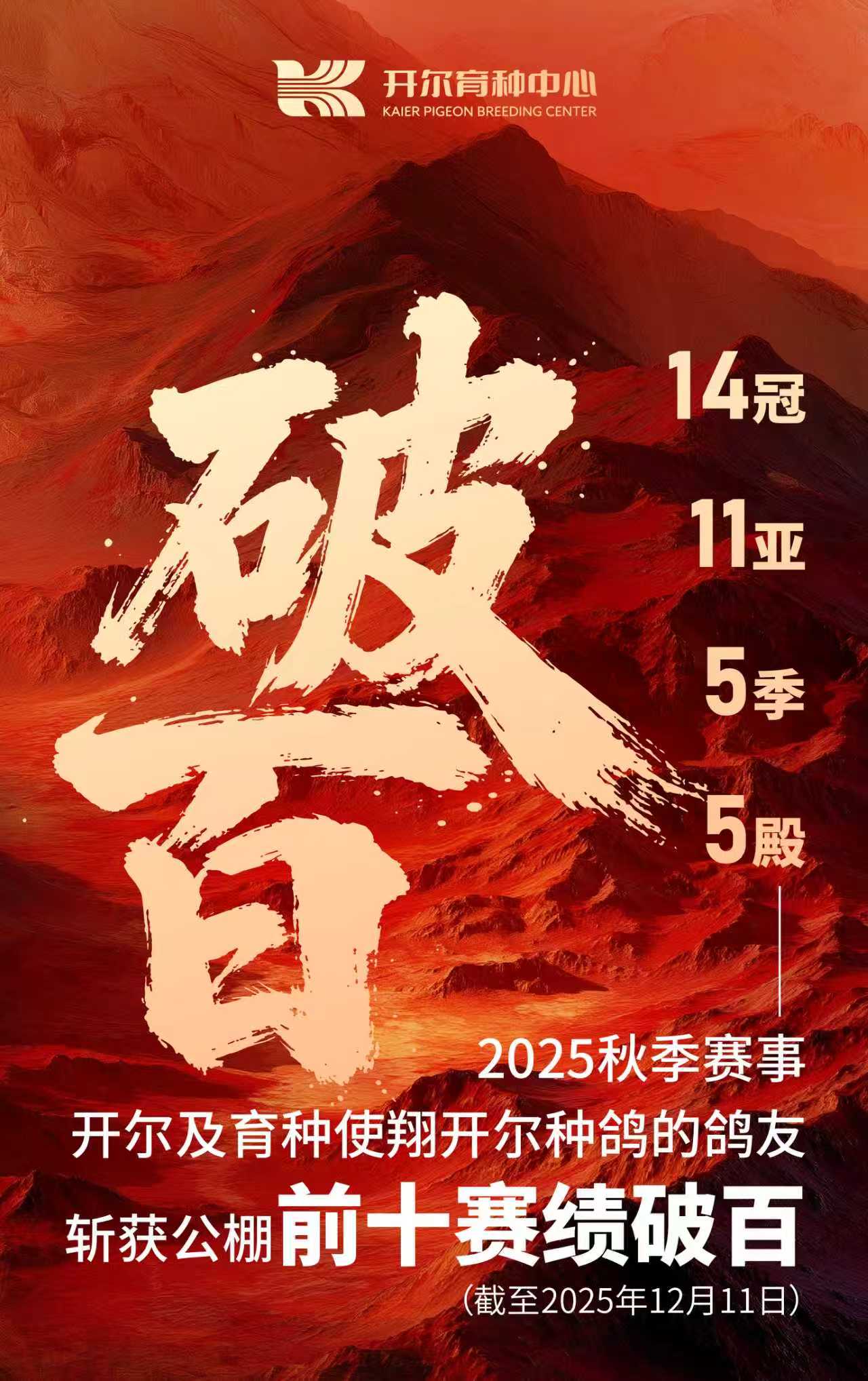 继在开尔、阳光等顶级赛场的统治级表现后,开尔铭血在竞争极为激烈的西南赛线——红枫赛场,再次交出亮眼答卷。25赛季,开尔种鸽助力鸽友征战红枫,累计7次跻身前十,并强势夺得包括大棚第二关冠军、决赛亚军、小棚决赛冠军、青年棚四关鸽王亚军在内的多项重磅荣誉。