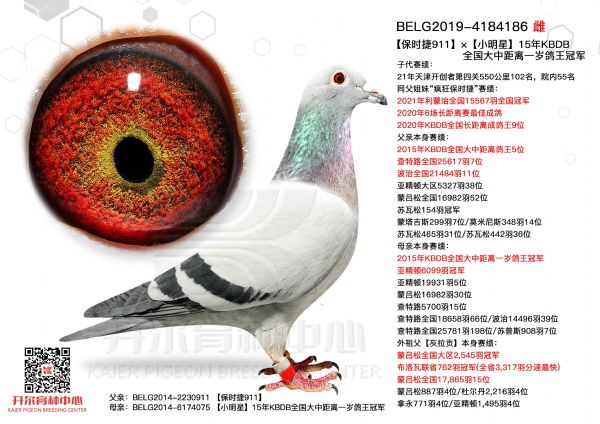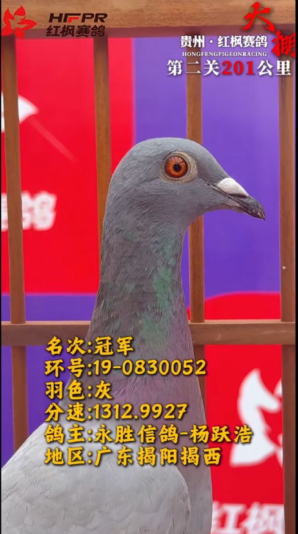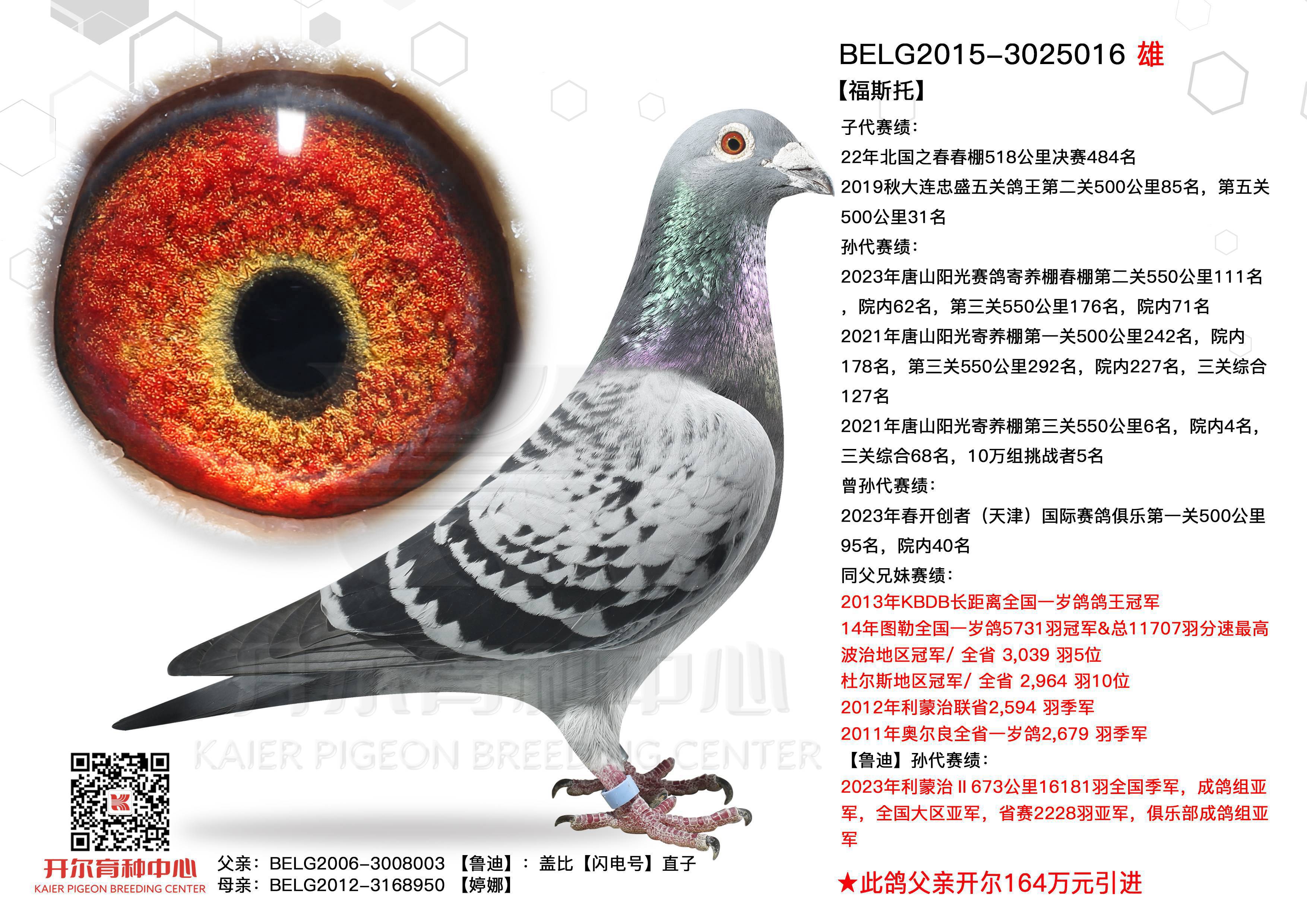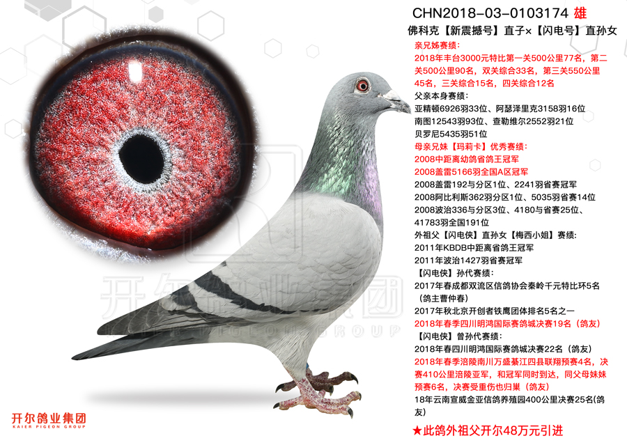 红枫大棚第二关冠军:父亲是WHZB全国长距离鸽王冠军阿伦德与掠火号直女的结合,掠火号由杨欧瓦克第一黄金配对掠夺者与圣火公主育出,母亲是柯勒直子与灰薇儿直女的结合,多重奶酪小子近亲回血作育。