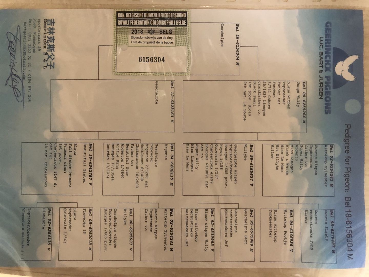 祖父:B02-6354241 旷世铭鸽白头席维特 黑斯拉特直子