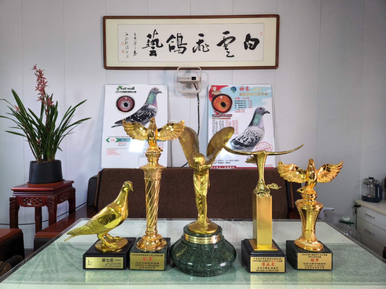 图片说明:奖杯:23年江苏宝宏公棚决赛冠军,24年江苏平安数字公棚加站赛冠军,25年辽宁众诚公棚决赛7名、三关鸽王7名,25年江苏瑞达国际赛鸽公棚决赛5名。
