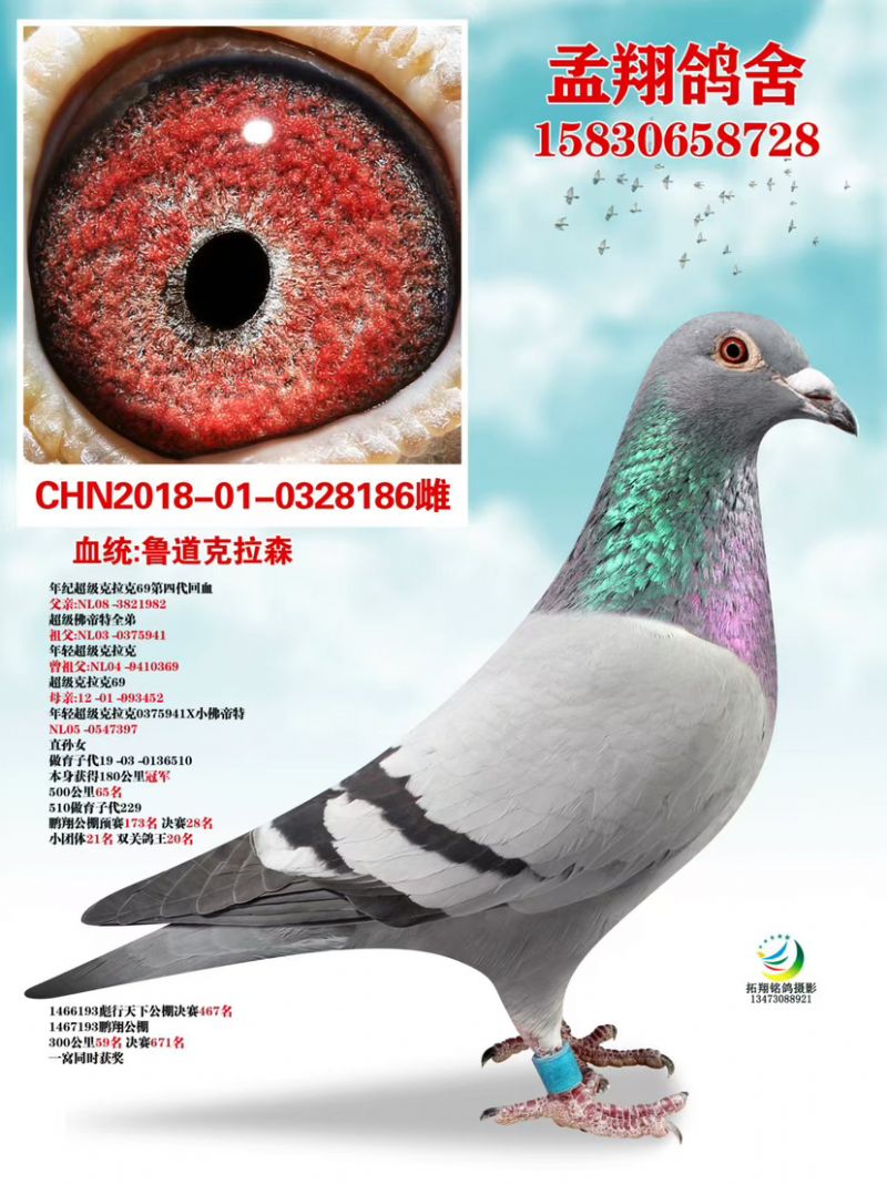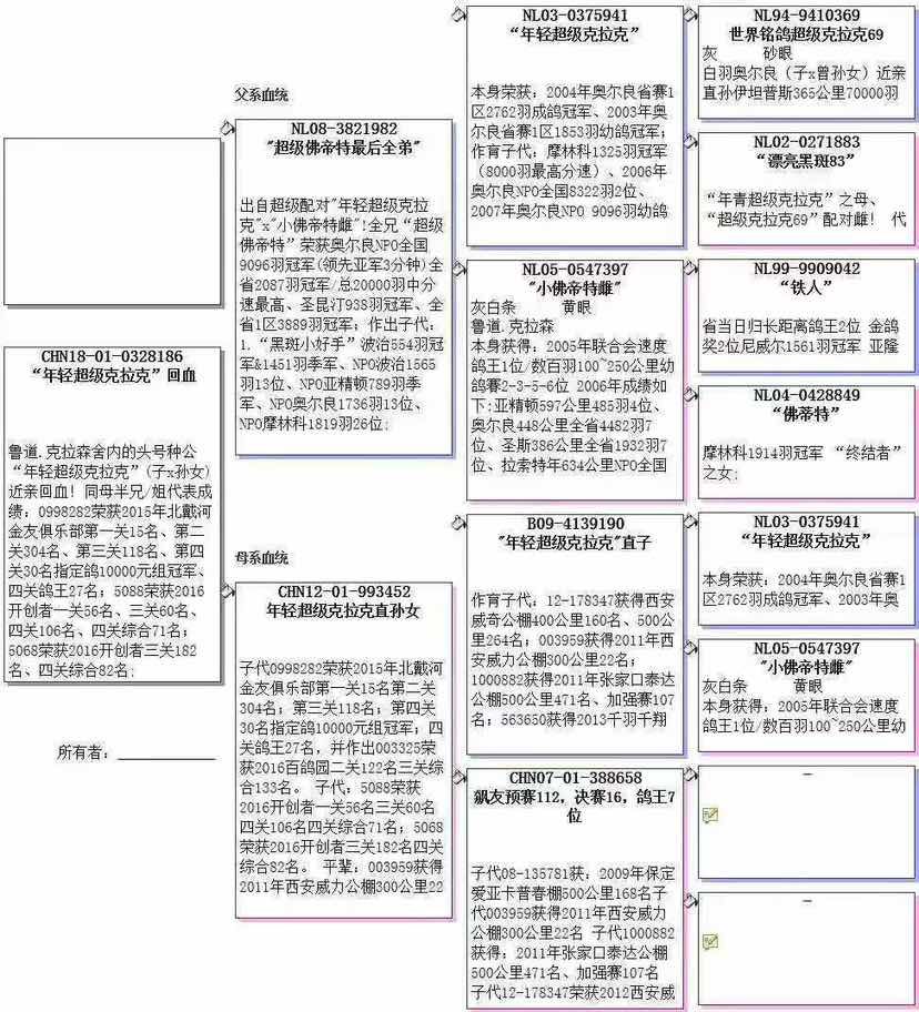 鲁道.克拉森舍内的头号种公 “年轻超级克拉克”(子x孙女) 近亲回血! 同母半兄/姐代表成 绩: 0 99 828 2荣获2015年北戴河 金友俱乐部第一关15名、第二 关304名、 第三关118名、第四 母系血统 关30名指定鸽10000元组冠军、 四关鸽王27名: 50 88荣获2016 开创者一关56名、三关60名、 四关106名、 四关综合71名: 5068荣获2016开创者三关182 名、四关综合82名: