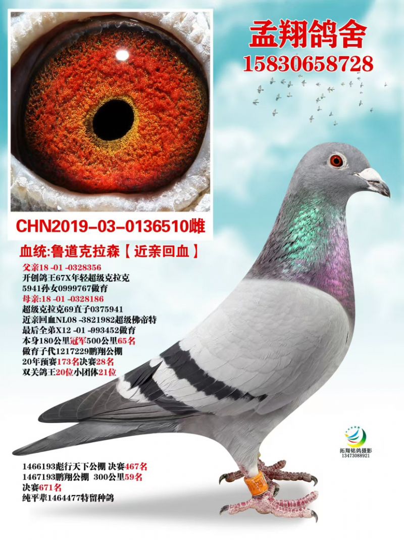 本舍超级种鸽.黄金配对雄507同父异母半弟24年春辽宁创翼公棚400公里257名,530公里45名双关鸽王13名,三关鸽王36名,赢得丰厚奖金 做育子代20年鹏翔公棚预赛173名决赛28名 小团体21名,双关鸽王20名 21年1467193鹏翔公棚300公里59名决赛671名 同窝1466193彪行天下公棚决赛467名 22年春1464500皓翔大棚400公里季军(赢得汽车一辆)550公里加站赛51名,赢得多项指定 22年秋天津宇航大棚200公里239名300公里607名400公里390名 22年2231111秋彪行天下公棚决赛31名,精英赛季军赢得多项指定,幸运汽车一辆,并作育0193101,23年彪行天下决赛204名精英赛40名,赢得多项指定,子代23年秋0193111彪行天下决赛295名,23年春2231084天津宇航春棚决赛143名,精英赛9名,赢得多项指定奖金, 曾孙代23年龙港公棚决赛46名等