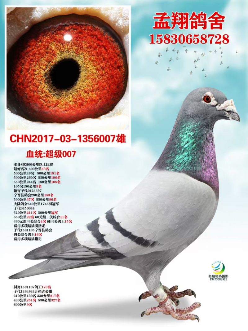 本身8次500公里,最佳代表成绩:500公里49名,53名,181名,196名,244名,260名等每年作育鸽王! 做育子代,597灰540公里冠军,044灰500公里冠军获得鸽王4鸽王11鸽王15,135四关综合鸽王16名,180公里最大羽冠军,137四关综合173名天立公棚762名等,开拓者公棚600公里9名等