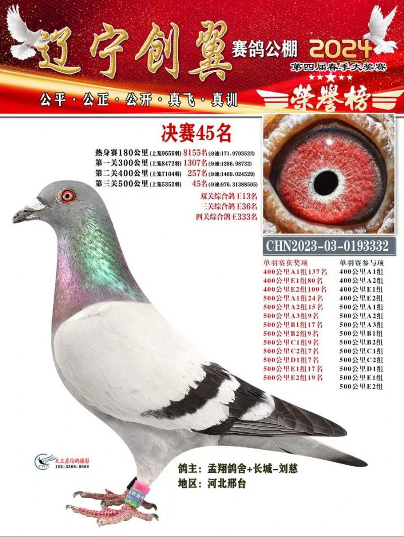 本身辽宁创翼公棚400公里257名决赛45名,双关鸽王13名