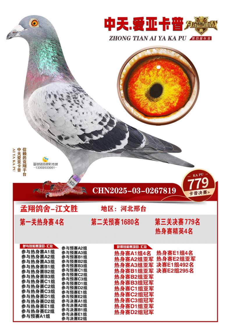 本身获得中天爱亚卡普180公里4名,精英赛4名全通全进,决赛500公里779名