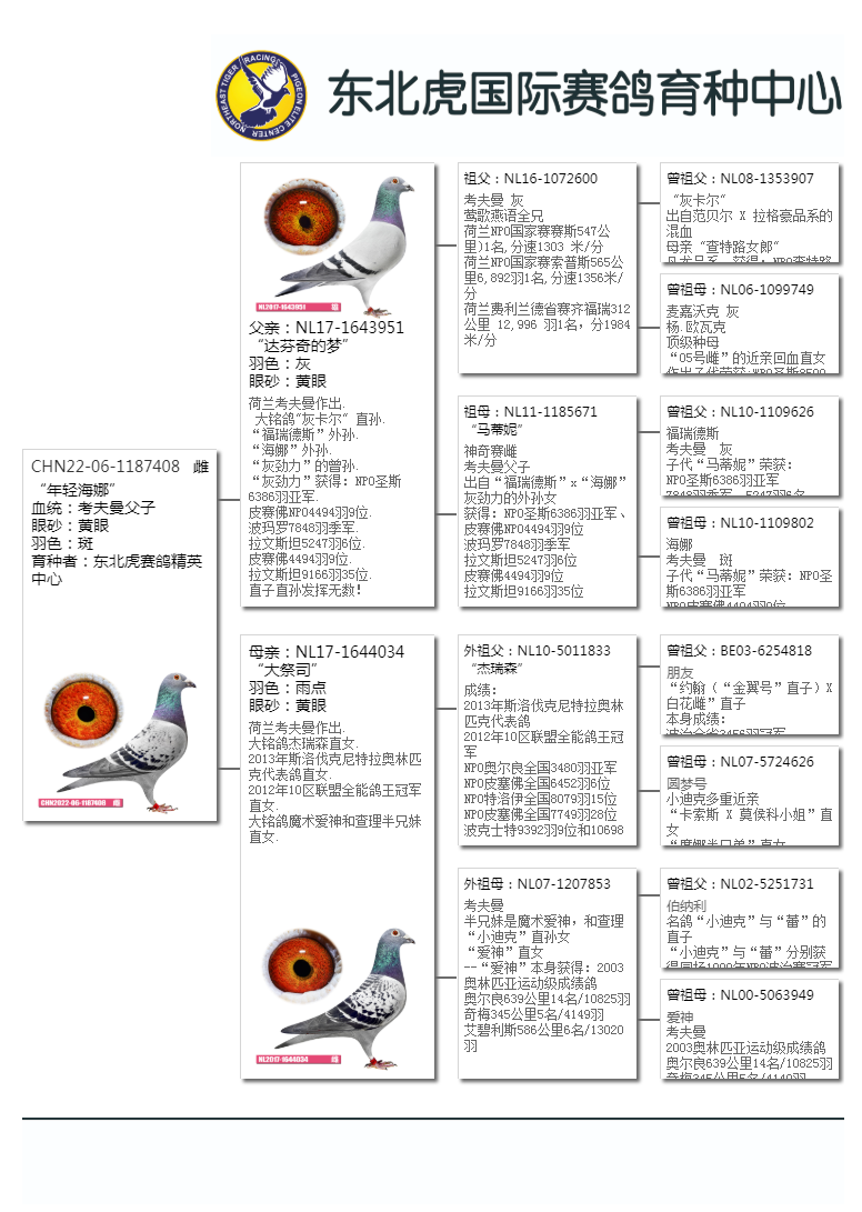 获得:NPO圣斯6386羽亚军、皮赛佛NPO4494羽9位