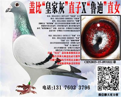 盖比“鲁迪”直女 BELG2011-3076117 父亲:BELG2006-3008003“鲁迪” 盖比“闪电号”直子直子“超级罗密欧”13年KBDB长距离全国一岁鸽鸽王冠军 直子“新闪电号”14年图勒全国一岁鸽 5731 羽冠军图勒全国11707羽分速最快总冠军直孙“鲁迪王子”15年利蒙治全国一岁鸽6275羽冠军 直孙“灰布瑞福号”16年布瑞福全国一岁鸽5925羽冠军 直孙... 浏览量:18564 次 [详细介绍] [询价]