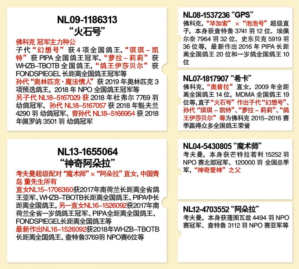 孙代“臭林匹克・魔法情人获2019年奥林匹克3 项预选鸽王,2018年NPO全国鸽王冠军等另子代NL18-5167029获2018年杜弗尔7769羽 幼鸽冠军、孙代N18-516707获2018年魁夫兰4290羽幼鸽冠军、曾孙代N18-5166954获2018年佩罗讷3501羽幼鸽冠军