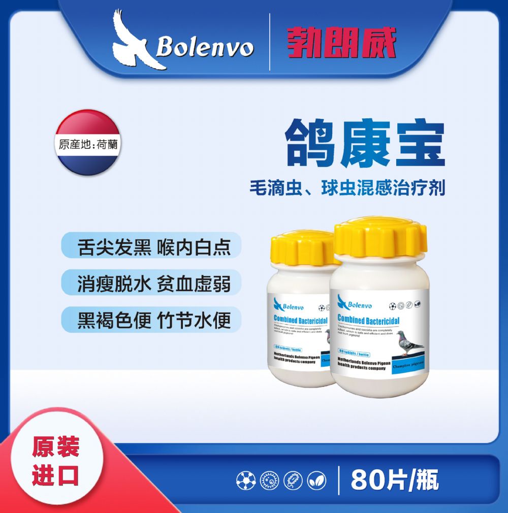 【功能主治】 球虫、六鞭毛虫以及因细菌的混合感染。适应于赛鸽咽喉部有白点、起痰或有干酪样积聚物,嗉囊胀满,不明原因的呕吐、贫血消瘦,飞翔耐力降低。特别适合赛事密集或多关赛调理。