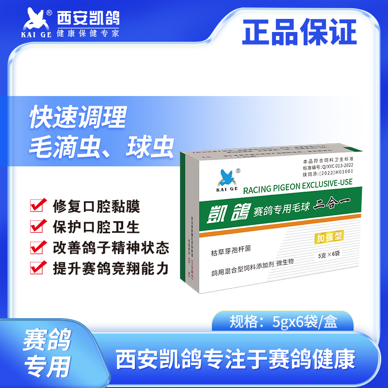 【商品名称】凯鸽毛滴虫、球虫二合一 【规 格】5g*6袋 本品能迅速有效的清除信鸽体内毛滴虫、球虫及其混合感染,使用后赛鸽肌肉富有弹性,呼吸通畅,粪便成形,飞行速度和耐力显著提高。 【适 应 症】:精神不振、羽毛耸立、不明原因呕吐、食欲减少、饮水量增加、水便、绿便、消瘦、耐力差、易疲劳、肉质松软、起黄、喉内有痰丝、黑鼻头等,重者拉粘液便、血便。 【用法用量】:饮水:每包泡水1500ml;拌料:每包拌料1公斤。预防1-3天,治疗3-5天。 注意:1.本品不能与其他毛滴虫、球虫药品同时使用。 2.用药后连续饮用凯鸽神液或凯鸽电解