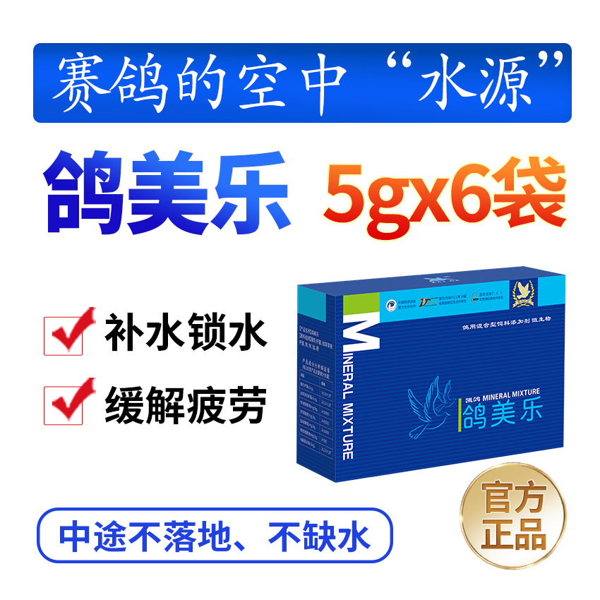 【商品名称】鸽美乐 【规 格】5g*6袋 【功 效】 1)连续使用三天后,赛鸽飞行高度明显变高,飞行时间耐久,返回后气喘现象减轻。 2)赛鸽飞行返回后口渴现象明显改善,大量饮水情况疏解。迅速解除疲劳,防治黑舌尖,黑胸难题。 3)喉咙明显干净,无湿黏状况。预防和治疗呼吸系统疾病。 【功能主治】 抗热止渴、降温散热、解除热紧迫,防止水分缺失;清除黑舌尖,紫胸(肌肉发紫发烫)症状,预防肌肉痉挛现象。使用后鸽子飞行时间延长,喘气现象减轻,喉头干净清爽,爱飞、高飞。 【临床报告】 比赛前使用可帮助鸽子顺利应付鸽笼中的闷热温度及赛飞中高温高热缺水影响,使之充满活力,轻松竞翔;赛飞返回饮用,可消除疲劳,放松肌肉神经,协助整理呼吸道。种鸽使用可增强育种机能并降低子代黑舌尖产生机率。 【用法用量】每袋是30羽鸽子一天的使用剂量,建议泡水1000ml,连用3-5天。