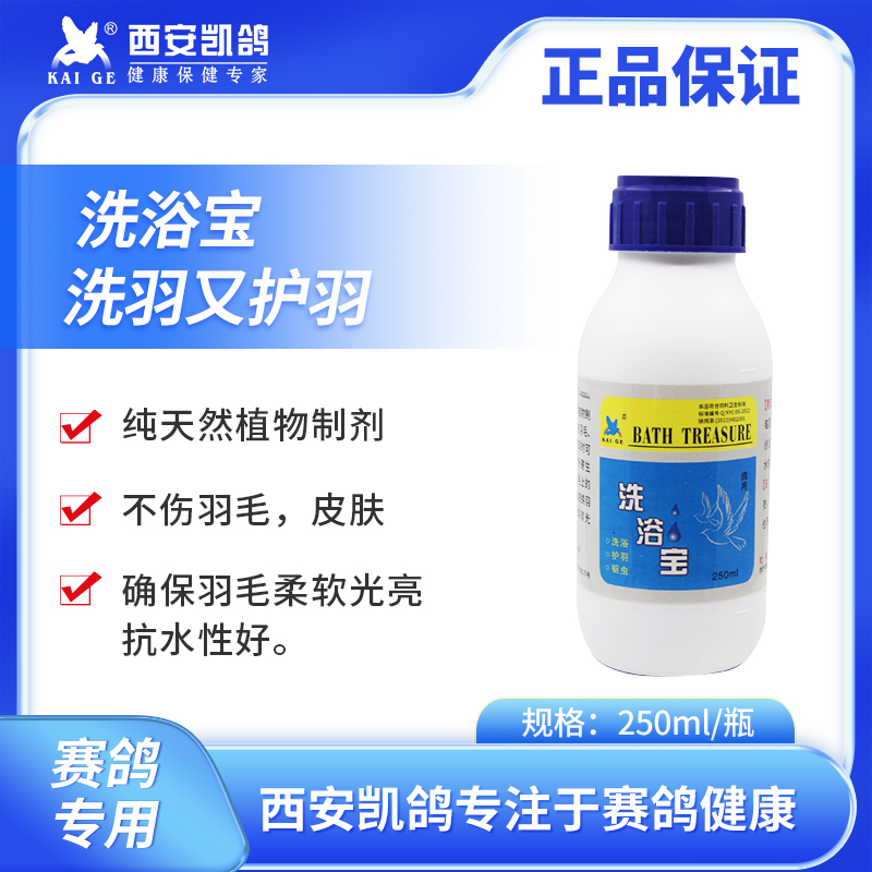 【商品名称】凯鸽洗浴宝 【规 格】250ml 【功 效】纯天然植物制剂,药性温和,不伤羽毛,皮肤,洗条羽毛的同时可快速杀灭鸽子体外寄生虫,去除皮肤,羽毛上灰尘皮屑,并能增进换羽速度,确保羽毛柔软光亮,抗水性好。 【用法用量】每周1-2次,每次20ml【约2瓶盖】兑5斤清水供鸽自由洗浴。