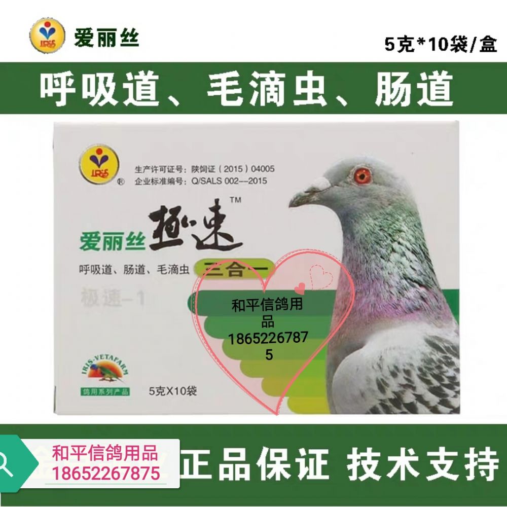 主要治疗赛鸽的肠道、呼吸道、毛滴虫综合感染等疾病。该药具有毒副作用低,见效快的特点。 【主要功效】1.治疗赛鸽呼吸道感染,口腔红肿、充血、有杂音、张口呼吸。 2.治疗肠道,赛鸽拉青绿色水便,成形状绿便,精神萎靡不振,不思饮食。 3.治疗毛滴虫感染、口腔内出现拉丝状、羽毛松乱、伸颈、鸽体消瘦。 【用法用量】1.治疗:每5克兑水1公斤,连用3-5天。 2.预防:每5克兑水1.5公斤,连续使用
