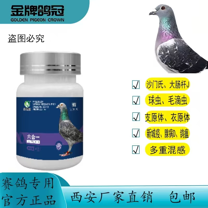 本品采用高科技技术,选用国际上的最新药物配制而成,具有防治赛鸽各种疾病的效果,在鸽友未能对鸽子的疾病做出正确诊断的时候,建议采用此产品进行治疗。 [功效] 1、消化道疾病:沙门氏菌,大肠杆菌引起的黄、白、绿粘便或水便; 2、呼吸道疾病:呼吸困难,低飞,张嘴呼吸,鼻流分泌物,咳嗽; 3、球虫:羽毛松乱、食欲减退、消瘦,排水样红棕色稀便、血便; 4、毛滴虫:口腔、咽部、嗉囊等部有溃疡或小白点; 5、支原体、衣原体:感染引起的鹦鹉热和单眼伤风; 6、病毒性疾病:新城疫、腺病毒、鸽瘟、鸽痘等传染性病毒疾病。 [用法用量] 盒装:每包5g兑水1000ml。 瓶装:每次1片。 1、预防与日常保健,每两周1次,每次1-2天; 2、治疗各种细菌性疾病及非特异性细菌引起的疾病时连用3-5天; 3、赛鸽赛前整理连用2-3天,放飞归巢或新入棚连用2天。