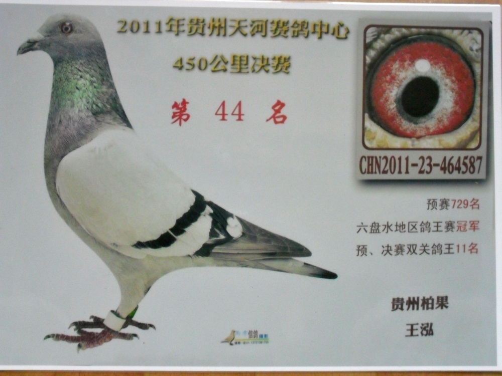 图片说明:本鸽业早期支援鸽友赛绩鸽,此鸽直子获得2012年春贵州盘县地方赛320公里冠军(领先亚军1小时12分),孙代荣获400公里季军、特比环大奖赛冠军!