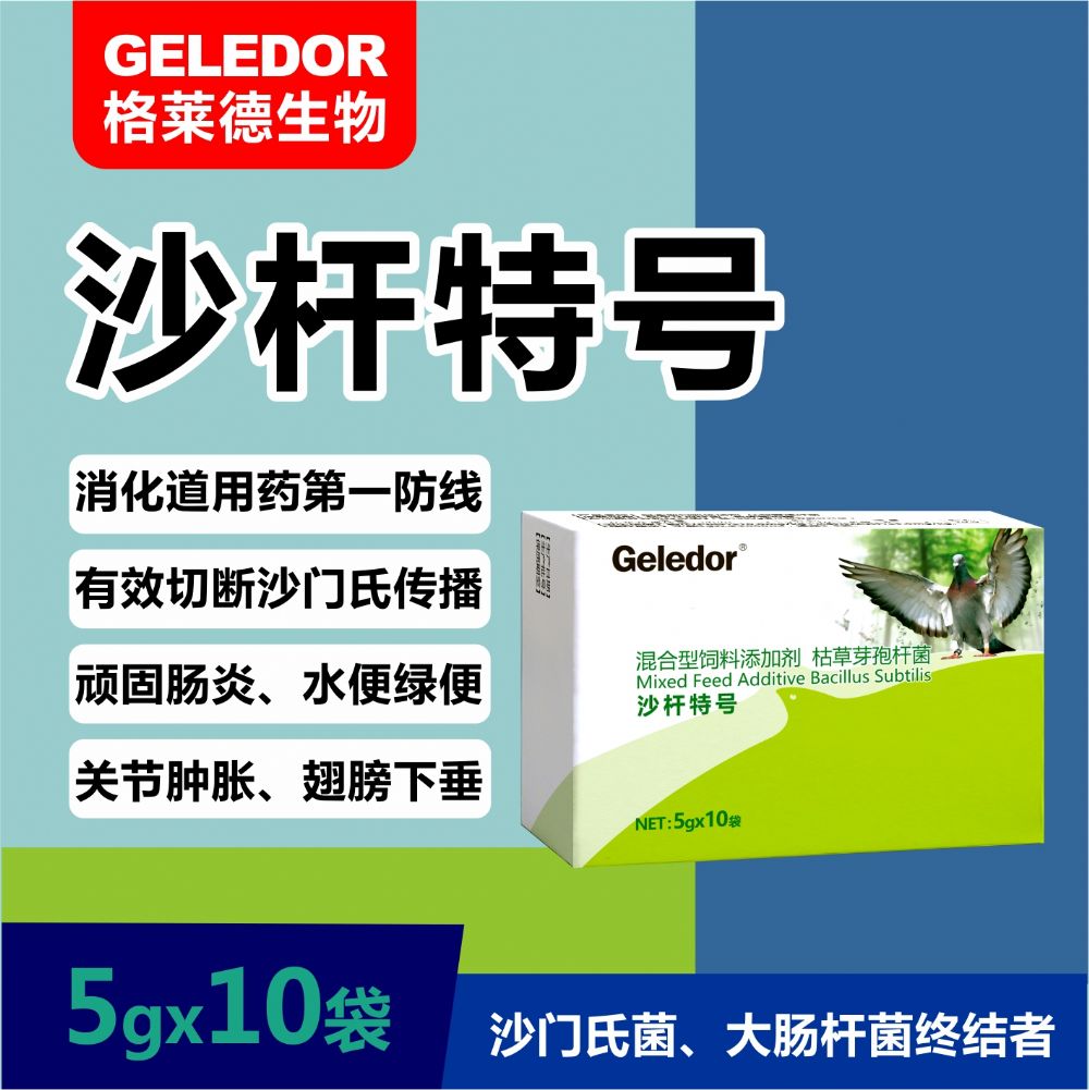 沙杆特号 规格:5g×10袋 消化道用药第一防线 沙门氏菌感染特效药 有效切断沙门氏垂直传播 【适 应 证】用于赛鸽敏感菌所致的肠道感染,如各型沙门氏菌、大肠杆菌感染。 1.沙门氏菌引起的雏鸽白痢、肠道型、关节型、内脏型、神经型副伤寒等疗效显著。 2.急性败血型、肉芽肿型、气囊炎型、肠炎型、关节炎型大肠杆菌引起的腹泻、下痢、心包积液、肝周炎、气囊炎、腹膜炎、急性败血症等疗效显著。 3.病鸽排水样或黄绿色、褐色、绿色带泡沫的稀粪,粪便中夹杂有未消化的食料; 4.关节肿胀,红肿发热,疼痛跛行,单脚站立,飞行困难; 5.内脏器官受损,肝脏、脾脏、肾脏肿大,睾丸炎、腹膜炎、卵巢炎; 6.翅膀下垂,歪头扭颈,摇头转圈、共济失调、抽搐震颤、飞翔障碍等; 7.细菌性白痢,排白色稀粪,伴有呼吸困难,食欲废绝等。 【用法用量】 预防:本品5g加水3000ml,每天1次,连用1-2天; 治疗:本品5g加水2000ml,每天1次,连用3-5天。