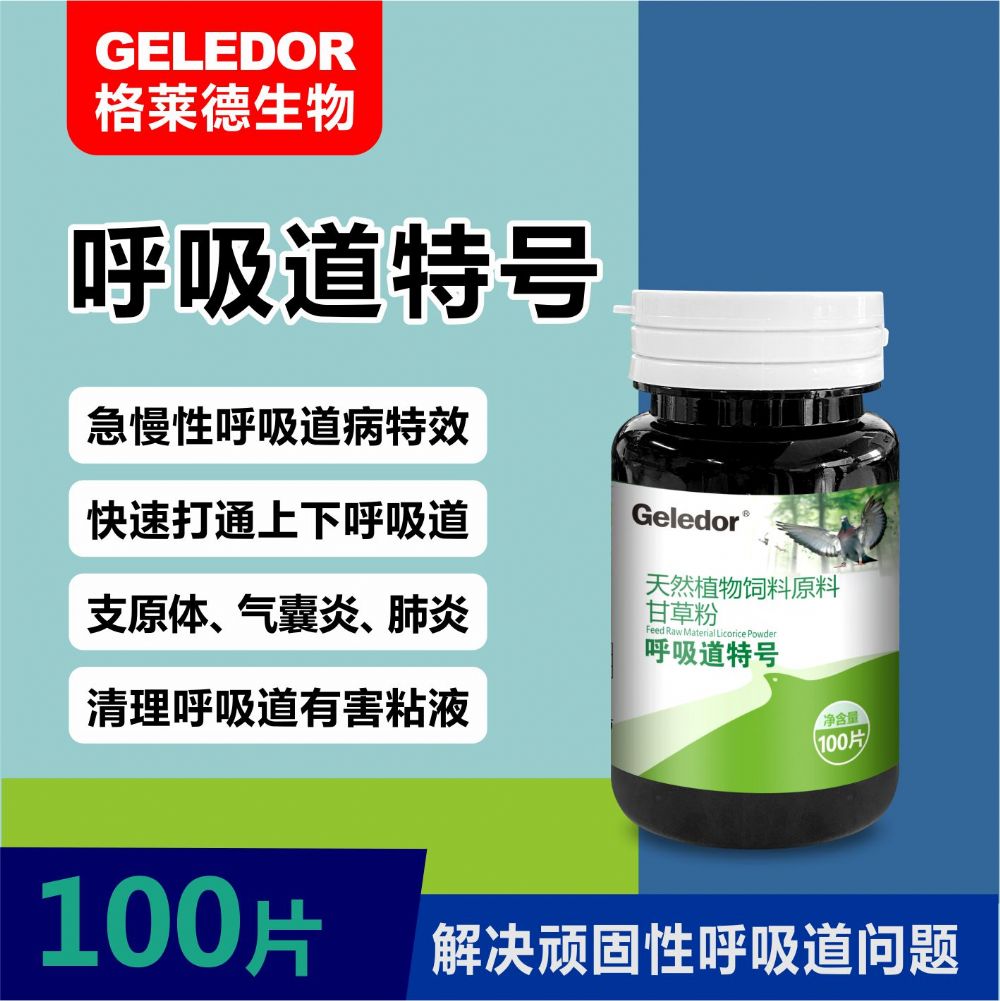 呼吸道特号 包装:100片 一次性打通赛鸽上下呼吸道 迅速清理呼吸道有害粘液 急慢性呼吸道病特效 【适 应 证】 用于赛鸽传染性胸膜肺炎、慢性呼吸道疾病、巴氏杆菌及支原体感染。对肺炎球菌、巴氏杆菌、支原体、衣原体、霉形体病、微浆菌、链球菌、炭疽杆菌等革兰氏阳性菌和阴性菌引起的急慢性呼吸道感染有效。 迅速清理赛鸽上下呼吸道,有效增加赛鸽飞行能力,提高呼吸质量; 消除呼吸道一切浓痰、粘液,确保呼吸道干燥、清爽、畅通呼吸; 敏感菌引起的咳嗽气喘、呼吸困难、流浆性或粘液性鼻液,眼睛有分泌物,眼脸肿胀等; 防治赛鸽慢性呼吸道病、支气管炎、气囊炎所引起的呼噜、甩鼻、气管有喘鸣声、眼睛红肿、伸颈张口呼吸、甩头、眼炎、体温升高等; 有效清理赛鸽气囊内杂质,使赛鸽气囊打开更完全,呼吸更顺畅,飞翔更轻盈; 预防病毒、细菌、毛滴虫引起的呼吸道复合感染症,快速控制呼吸道症状; 防治赛鸽紫胸、黑舌,不爱飞、飞不快等,提高血氧含量,增强体能,提高飞行速度。 【用法用量】 内服:预防,每次1片,每天1次,连用1-2天; 治疗,每次1片,早晚各1次,连用3-5天。