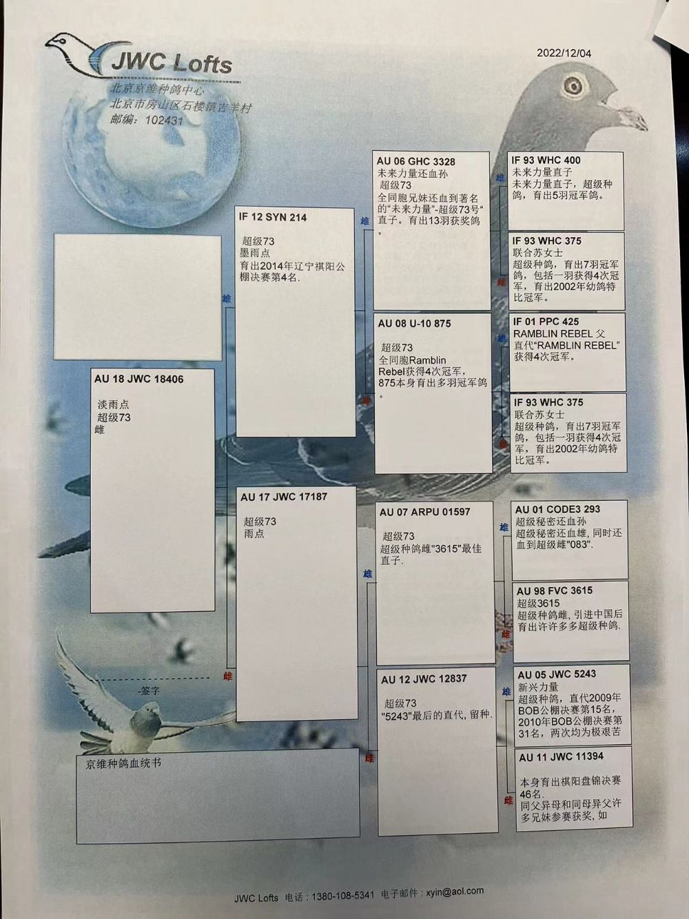 拍卖运费请加微信直接支付北京首航托运公司,微信号:13693007901,汽运及火车运输:按次数计算,每次200元,得标4羽内(含4羽)按200元计算,每增加一羽加价50元。空运:按次数计算,得标4羽内,每次按600元支付,增加一羽加价50元,如需中转加150元中转费。鸽友需自行到指定机场或可到达之长途车站取鸽。