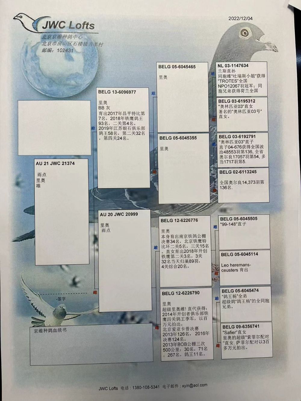 拍卖运费请加微信直接支付北京首航托运公司,微信号:13693007901,汽运及火车运输:按次数计算,每次200元,得标4羽内(含4羽)按200元计算,每增加一羽加价50元。空运:按次数计算,得标4羽内,每次按600元支付,增加一羽加价50元,如需中转加150元中转费。鸽友需自行到指定机场或可到达之长途车站取鸽。