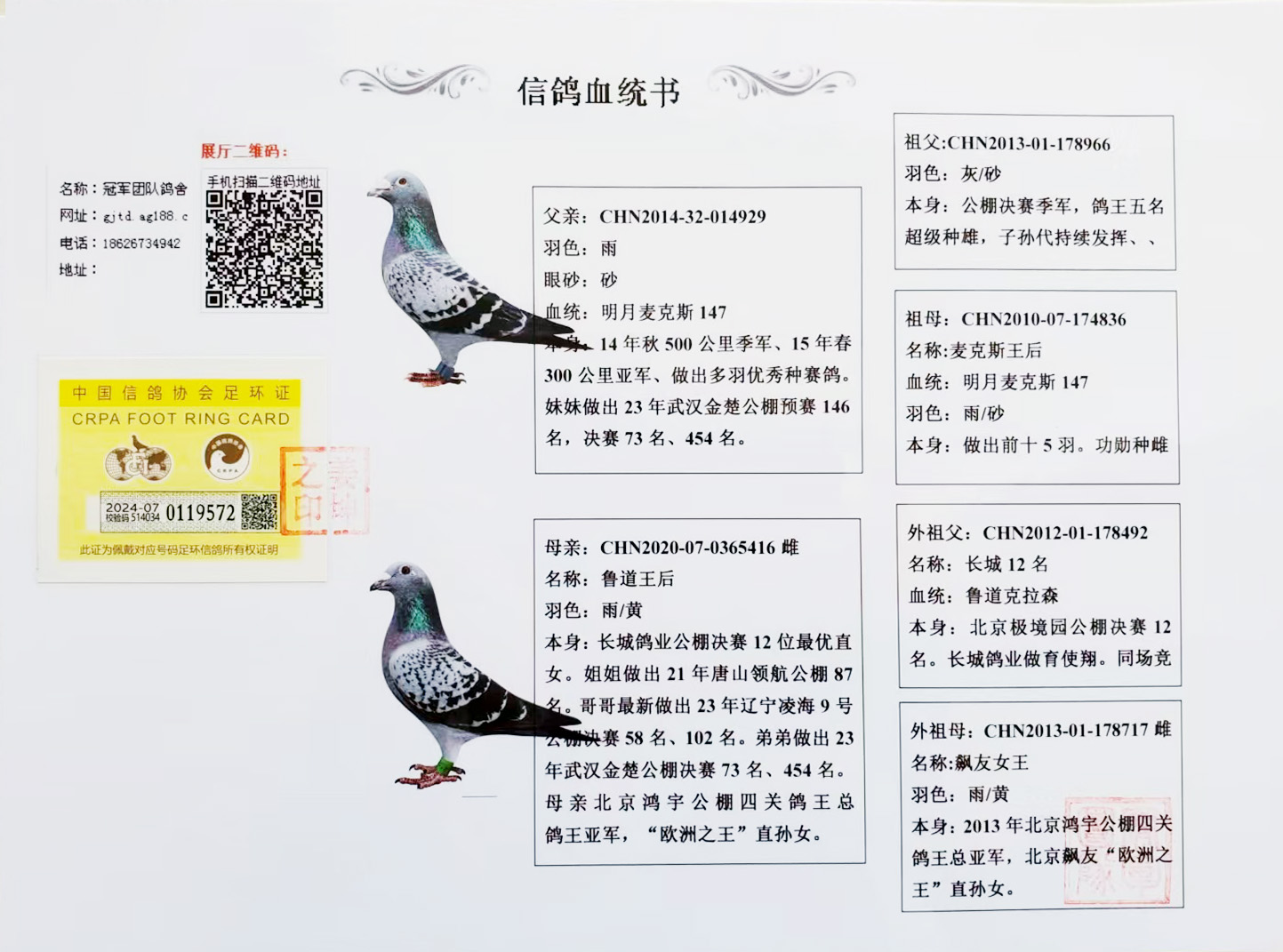 拒卖假鸽,成绩、血统永久保真。血统书足环卡随鸽发出。如假双倍赔偿