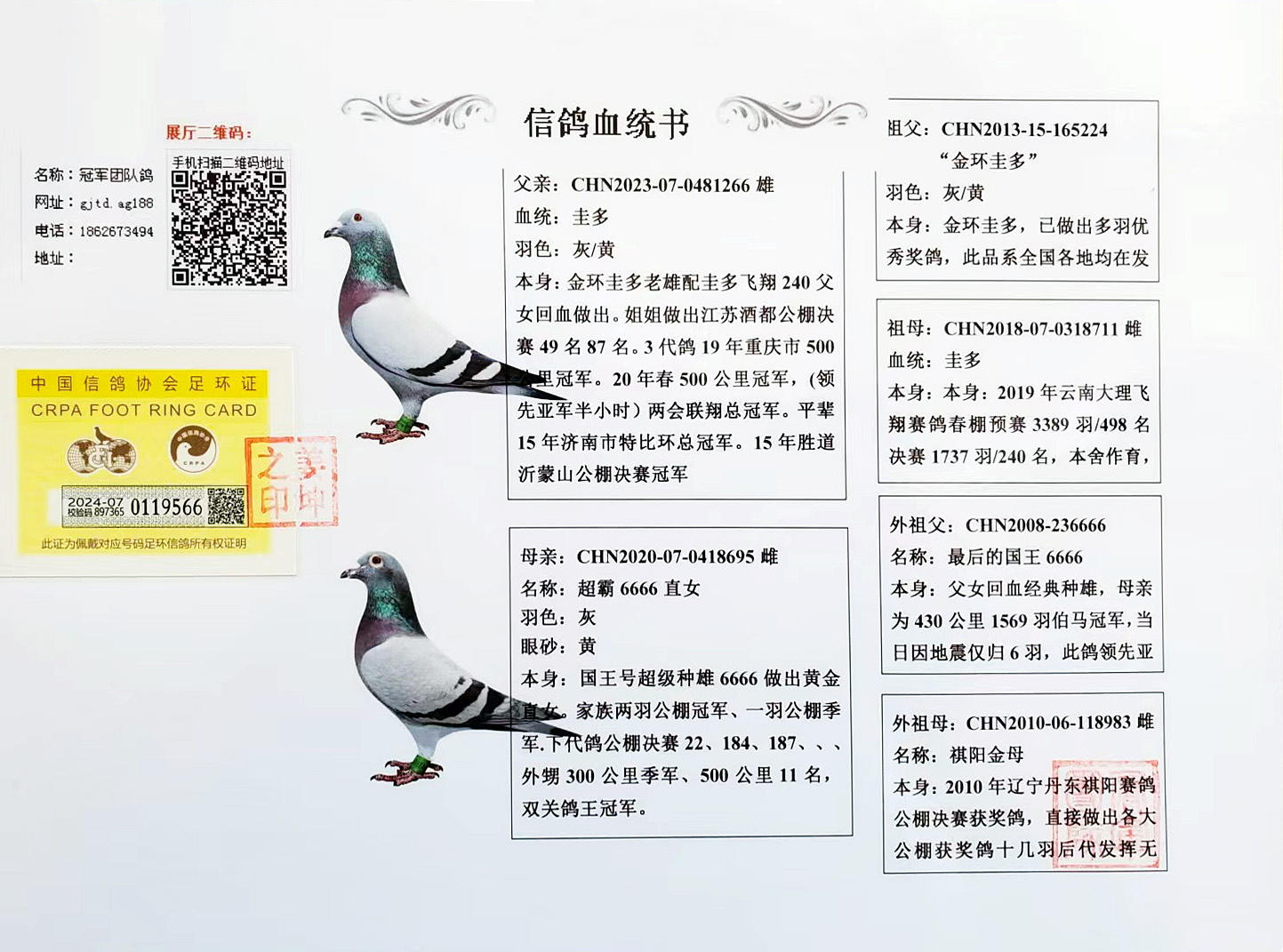拒卖假鸽,成绩、血统永久保真。血统书足环卡随鸽发出。如假双倍赔偿