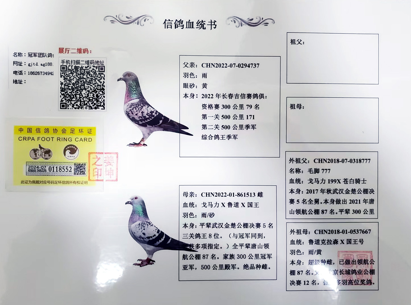 多年积攒!只卖真品,莫和假鸽比。成绩、血统永久保真。血统书足环卡随鸽发出。如假双倍赔偿。