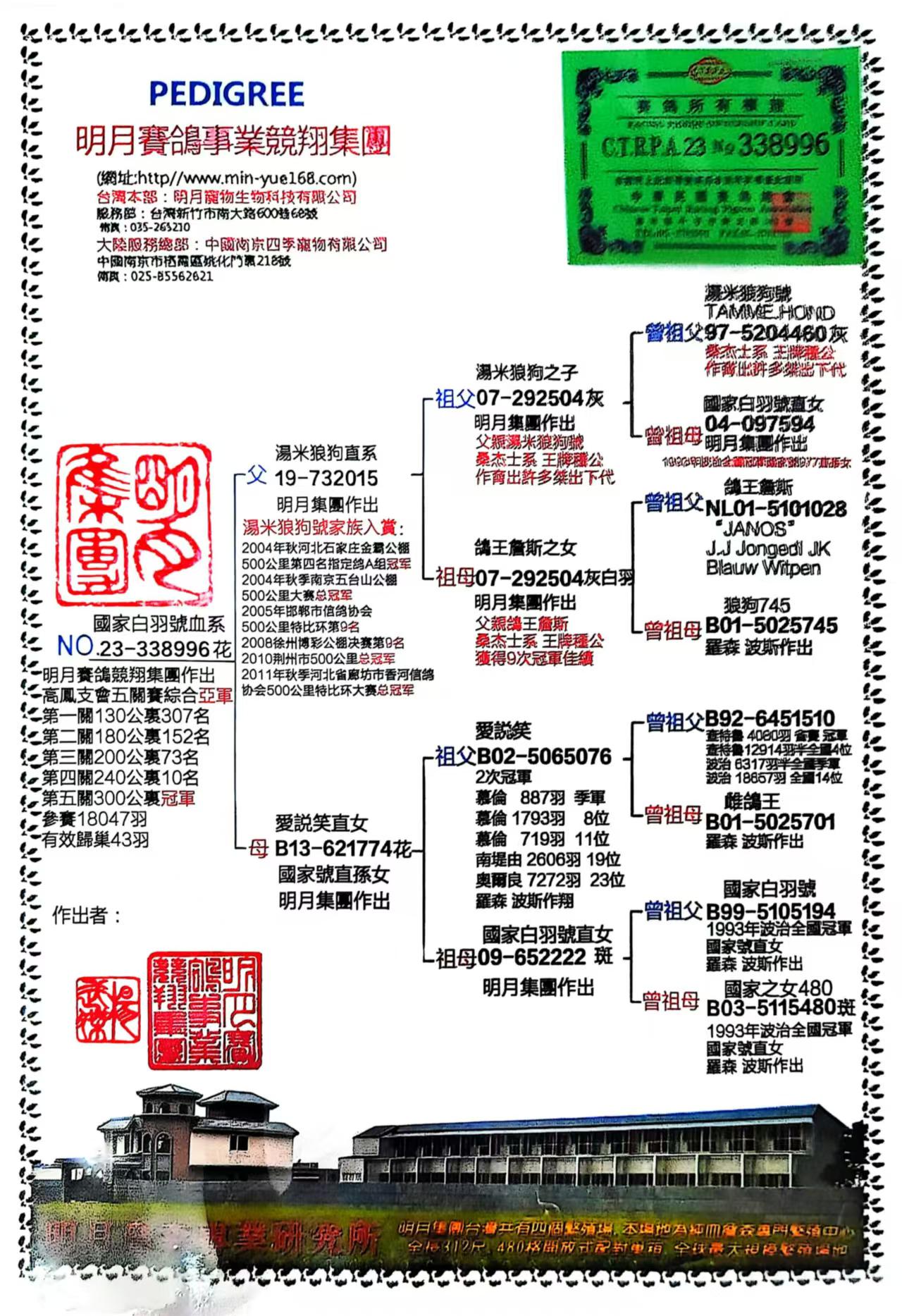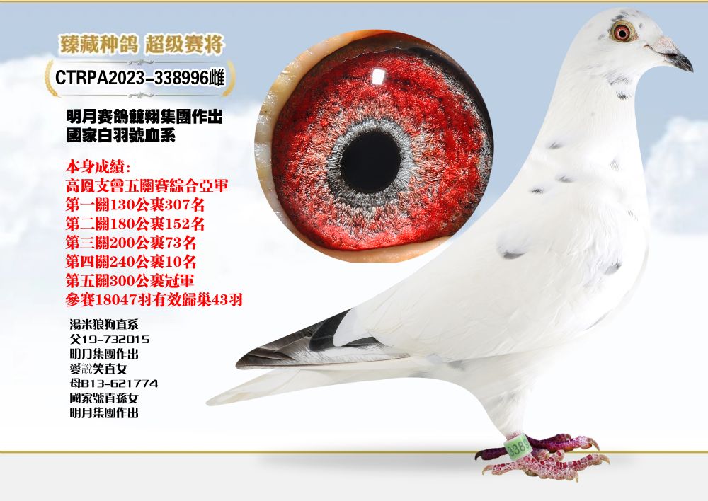 - 当前查看拍卖鸽:台湾明月赛鸽集团国家白羽号血系本身五关综
