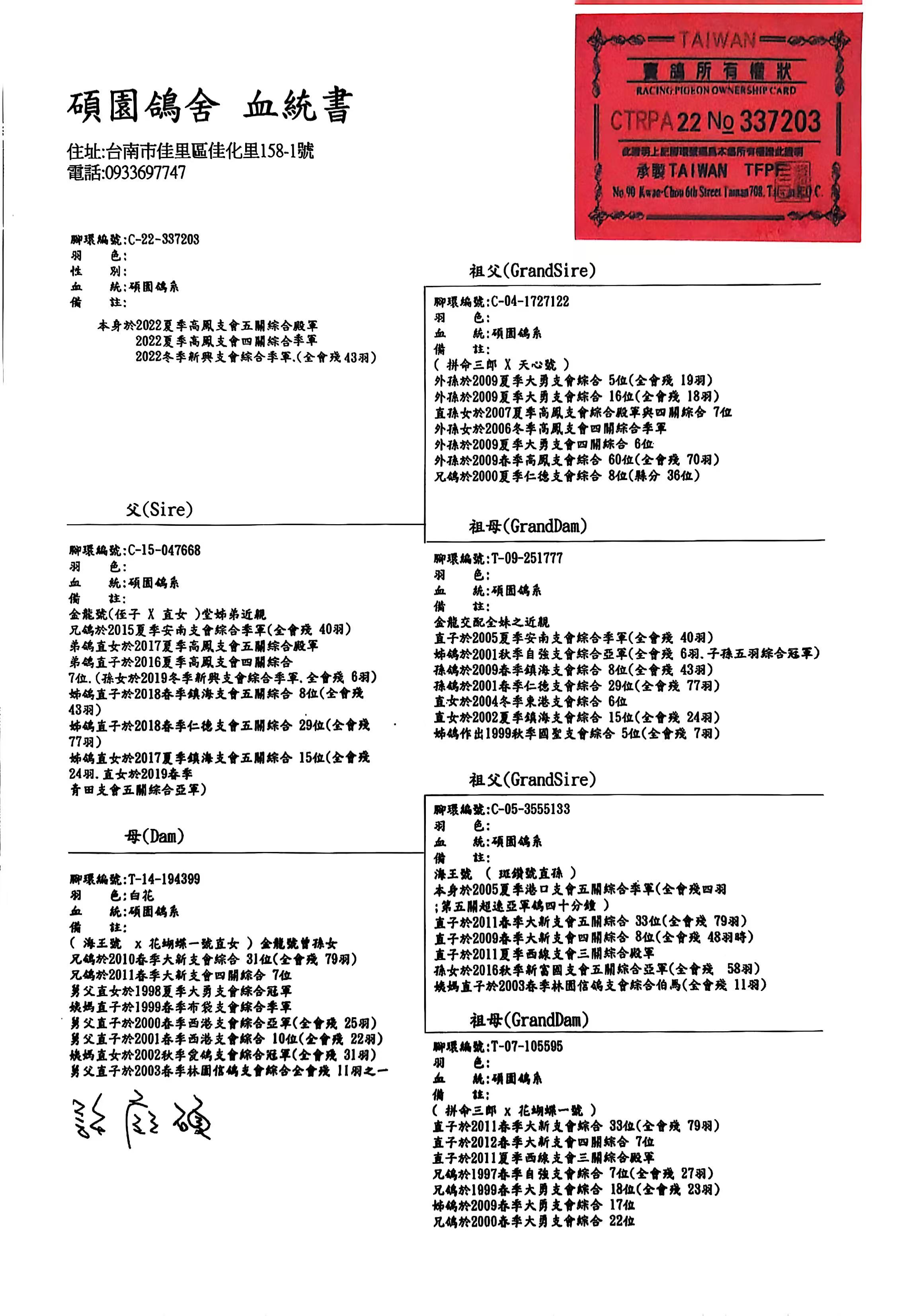 - 当前查看拍卖鸽:台湾硕圆鸽舍硕圆鸽系本身四关综合季军