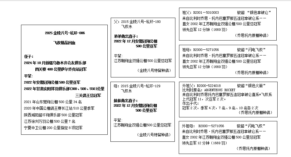 金陵八号2020年获江苏金翼公棚400公里6名,加强赛4名,精英赛冠军(飞奴)