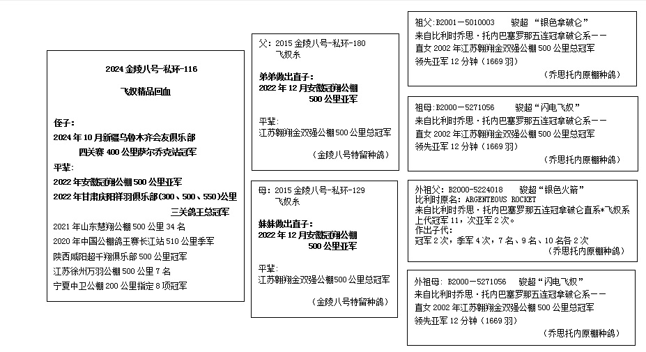金陵八号2020年获江苏金翼公棚400公里6名,加强赛4名,精英赛冠军(飞奴)