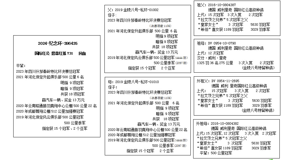 三关鸽王冠军,四关鸽王亚军,二关鸽王亚军,精英赛6名,500公里决赛9名,560公里加站赛3名,560公里排名赛6名(乔 花 飞奴)