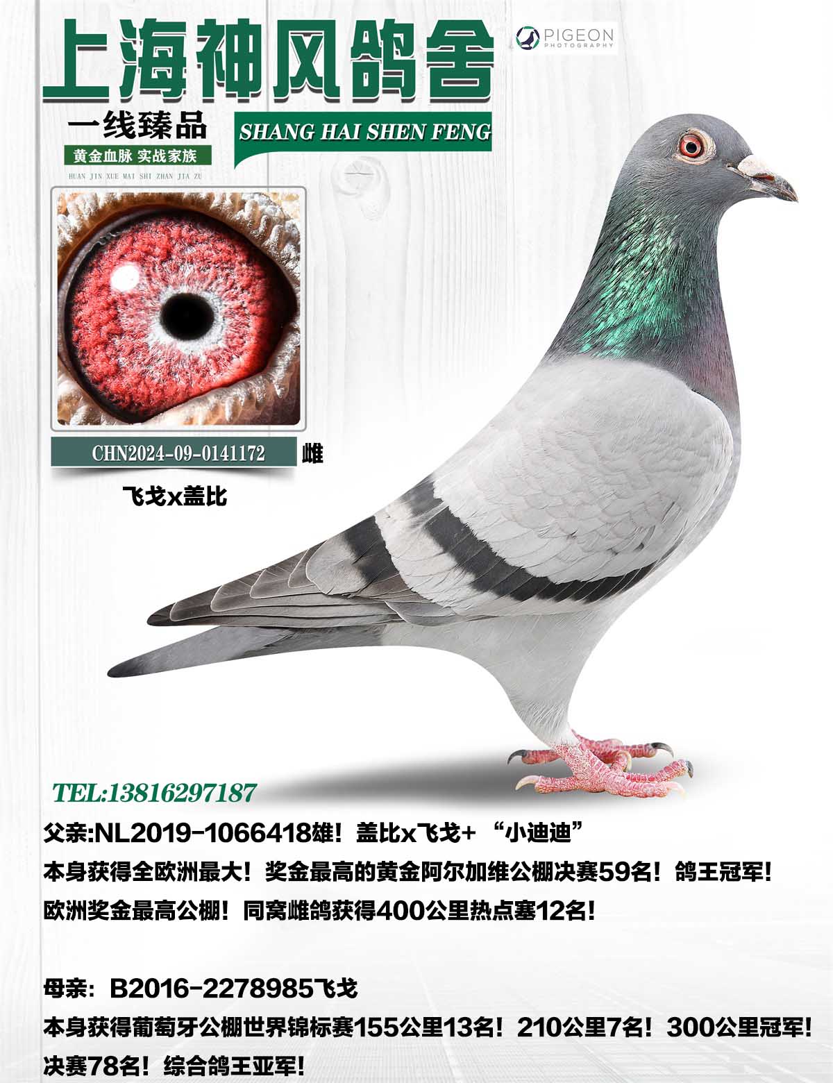 本身获得全欧洲最大!奖金最高的黄金阿尔加维公棚决赛59名!鸽王冠军!欧洲奖金最高公棚!同窝雌鸽获得400公里热点塞12名!